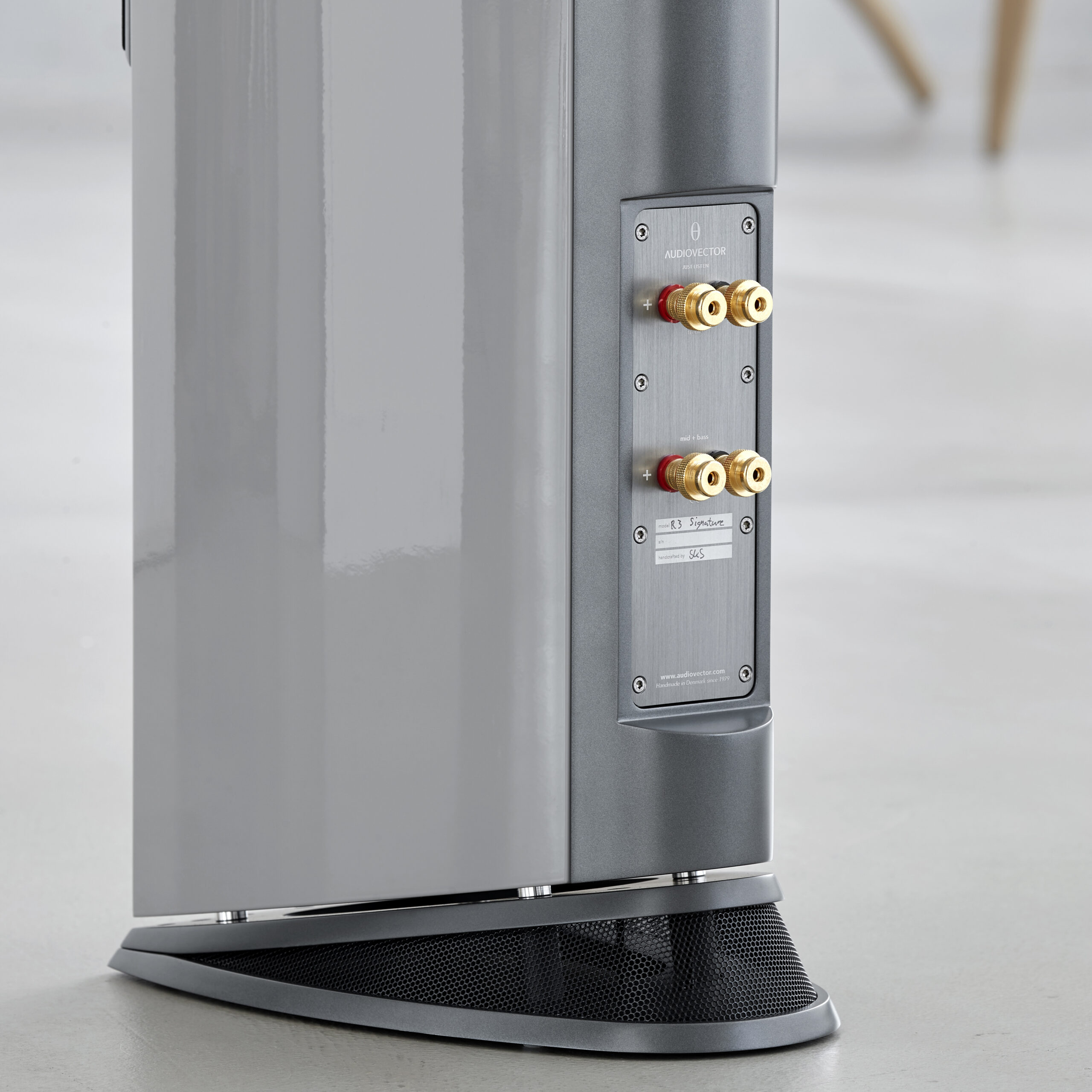 Kabinetterne i R3 Signature er lavet af fiberplader med høj tæthed (HDF), hvor de fleste andre højttalere bruger medium tæthed (MDF). Den smalle frontplade og de buede sider med den skrå bundplade giver mindre diffraktion og dæmper stående bølger bedre – og Audiovector behøver derfor ikke at bruge en masse hæmmende dæmpning indvendig. Det holder med nogle få måtter.