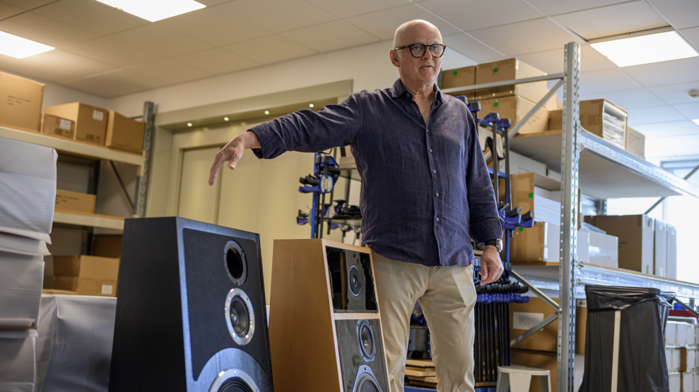 Det er jeg glad for, fordi han i stedet for at pensionere sig, er dykket ned i arkivet, og har fundet tegningerne frem til noget, han lavede i sidste årtusinde. Dengang, i 1979, var det formet på en opsigtsvækkende skæv måde, næsten asymmetrisk. Kabinettet var trapezformet fra næsten alle vinkler. En umulig opgave for en, der skal samle kabinetternes skarpe vinkler til noget, der lyder godt.