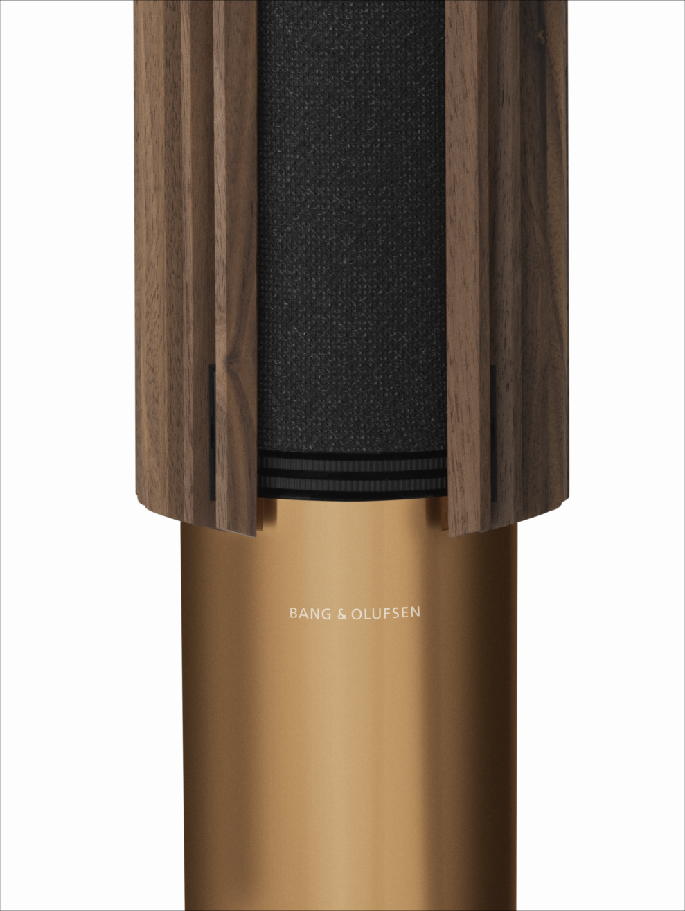 Træværket sidder fast på motoriserede beslag, som langsomt trækker lamellerne væk fra fronten af højttalerne, når man tænder dem – og lige så langsomt glider frem og dækker den grå front, når man slukker for dem.