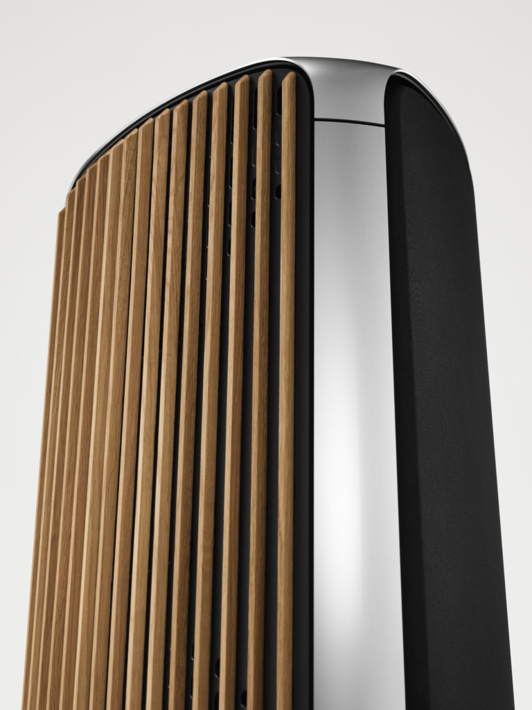 BeoLab 50 har et klassisk B&O-udtryk, som det er svært at tage fejl af. Den blankpolerede skal af aluminium, trælameller i eg og den karakteristiske Acoustic Lens diskant-enhed på toppen får 50’eren til at ligne en mere muskuløs udgave af den superslanke BeoLab 18.