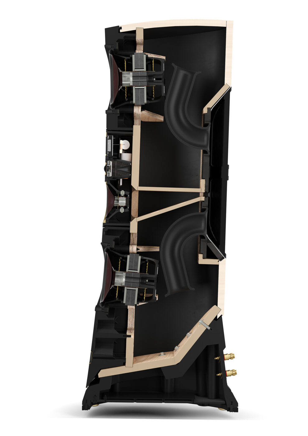 Basenhederne er monteret i to identiske 72 liters adskilte kamre med to buede basrefleksporte, der ender i to åbninger på bagsiden.