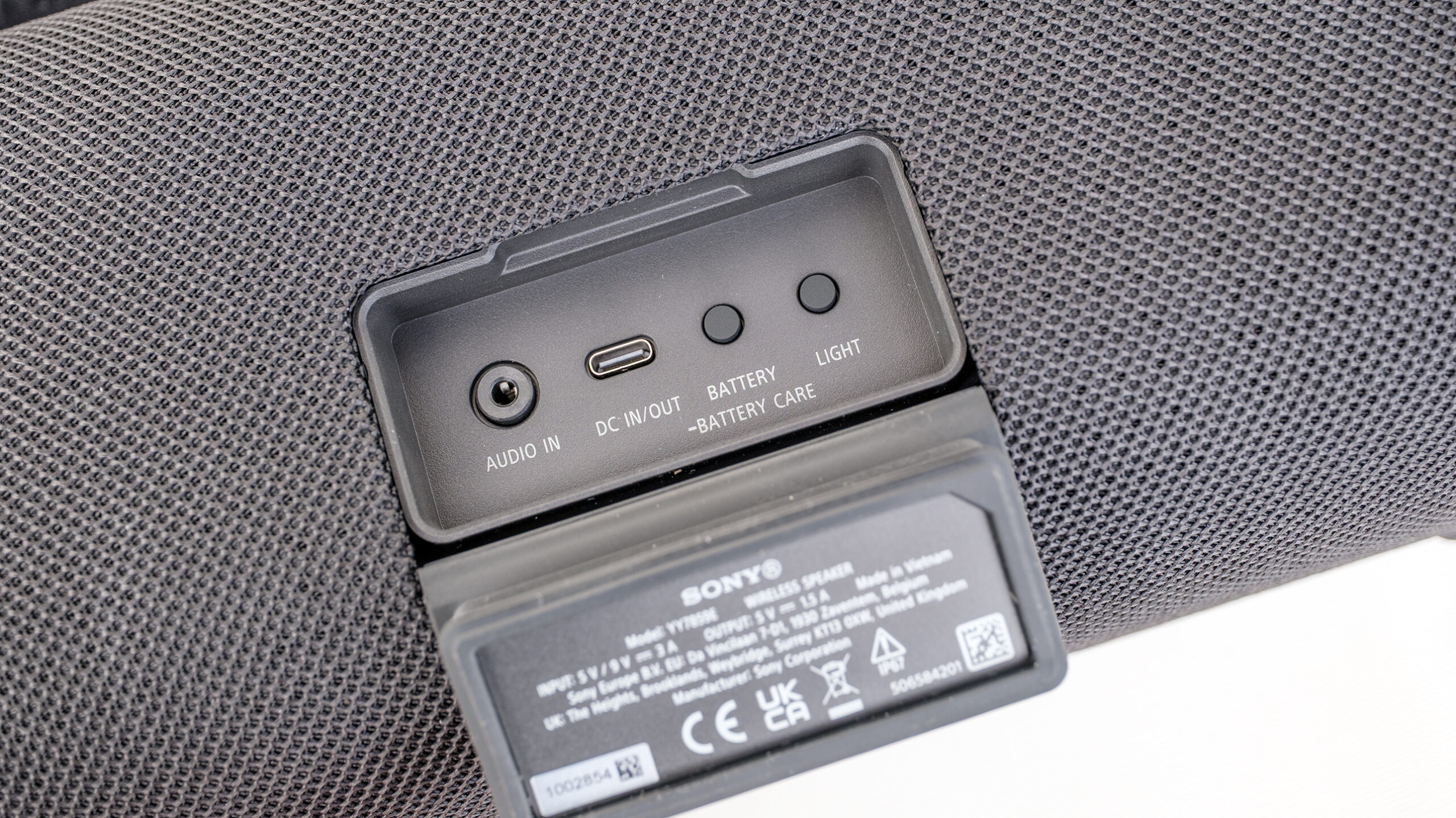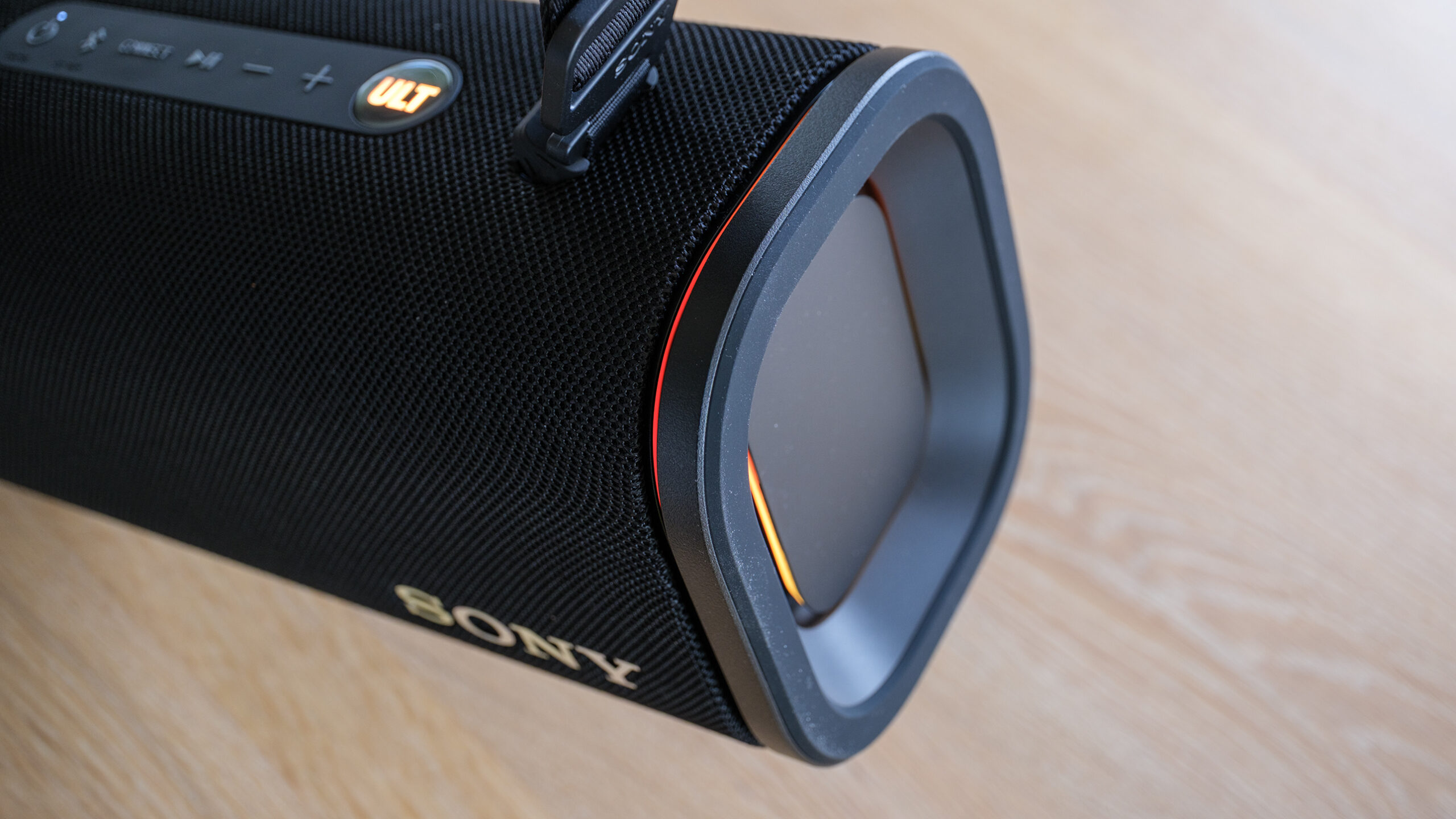 Sonys ULT Field 5 er den næststørste højttaler i testen, og den giver dig et lysshow, der blinker i takt med musikken. Det blinkende lys kan slukkes, enten fra Sony-app’en eller fra en knap under et stænksikkert låg på bagsiden. Der er også en minijack-indgang til eksterne lydkilder.
