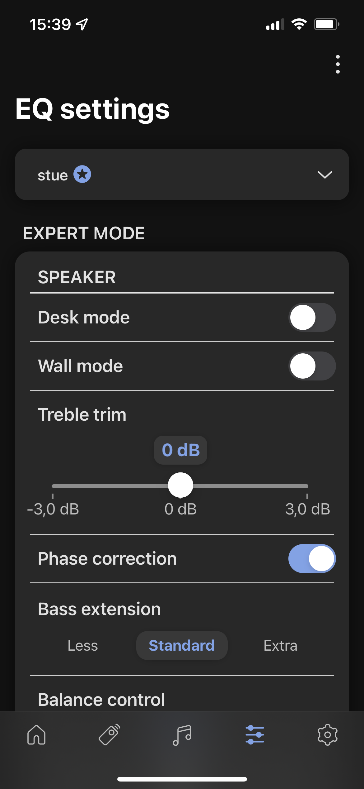 Det er også her, man styrer bas og diskant og fortæller højttalerne, hvilken der skal være venstre og højre kanal, hvis de er placeret i en reol eller på et vægstativ.