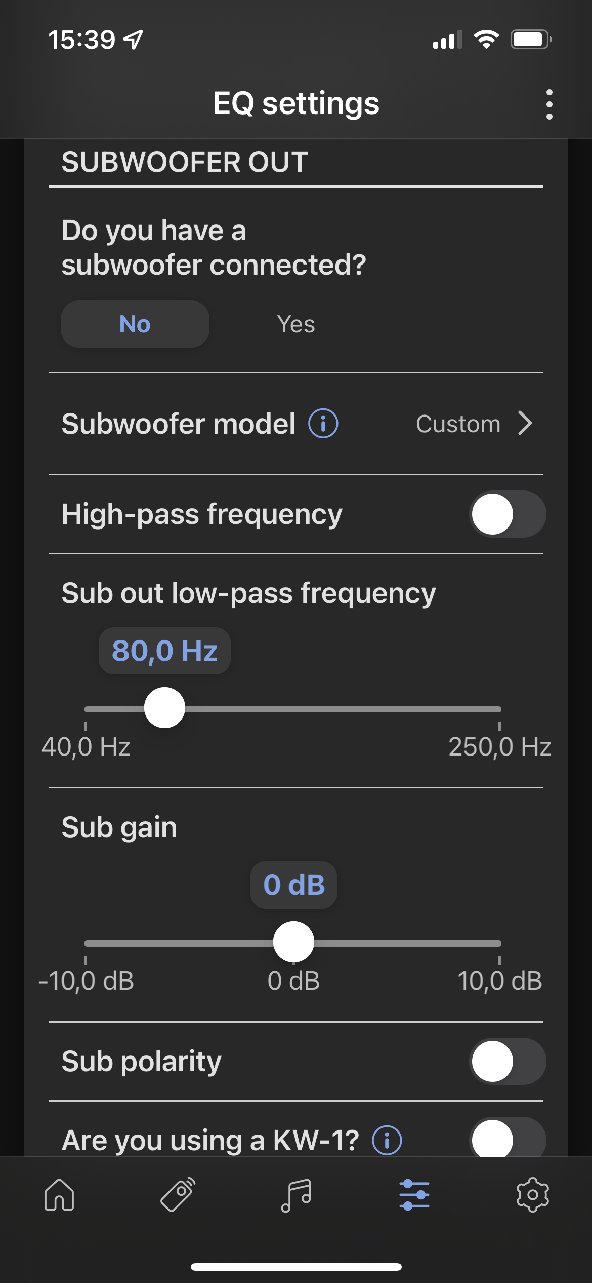 Alle grundlæggende funktioner kan nemt styres med fjernbetjeningen. Men man må downloade KEF Connect-app’en for at sætte højttalerne op første gang. Det er også i app’en, man tilføjer en subwoofer. Er det en KEF-sub, skal man blot vælge model, og så indstilles delefrekvens og niveau automatisk. For andre subwoofere må man selv justere lavpas- og højpasfrekvens, niveau og fase i app’en.
