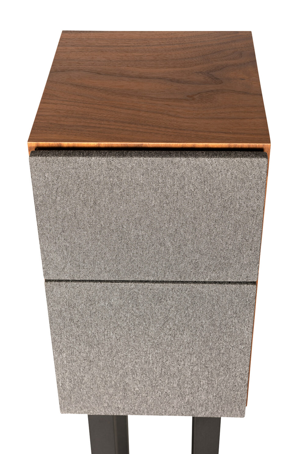 Det ydre er mindst lige så lækkert som det indre. Kabinettet er fineret med valnød, hvilket i sig selv er en fornøjelse at se på. Men en indlagt vandret stribe og logo i en anden træsort gør indtrykket ekstra raffineret. Har man ikke lyst til at se på de pæne højttalerenheder, kan man skjule dem bag frontstoffet, der er delt i to og fæstnes magnetisk.