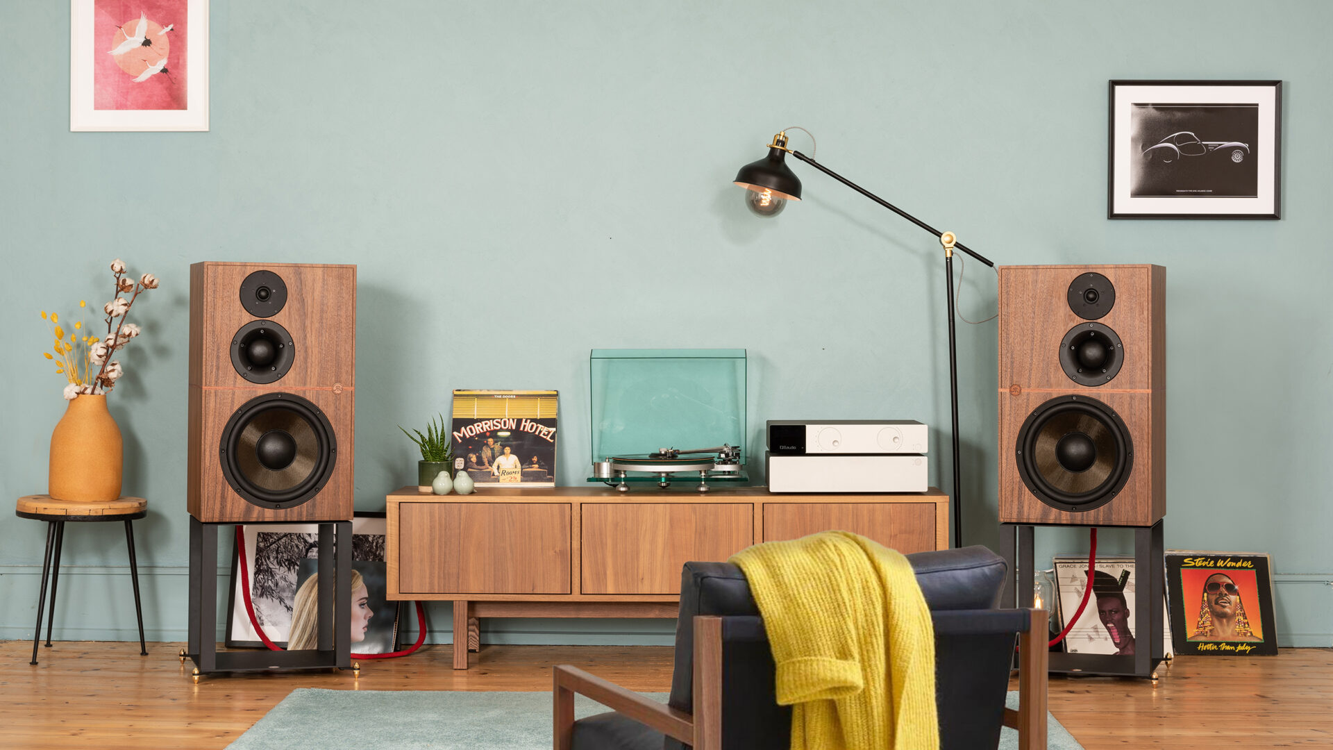 Højttalerne kan faktisk anbringes på gulvet. Der er endda indbygget en lille træliste i bunden, der vipper dem nogle grader bagover. Men gulvplacering giver så mange kompromiser i form af overdrevet bas og perspektiv i gulvhøjde, at det må frarådes. I stedet bør højttalerne monteres på de standere, der er konstrueret til dem. Hvilket forøger prisen med godt tre tusind kroner og gør de i forvejen store højttalere meget dominerende i stuen.