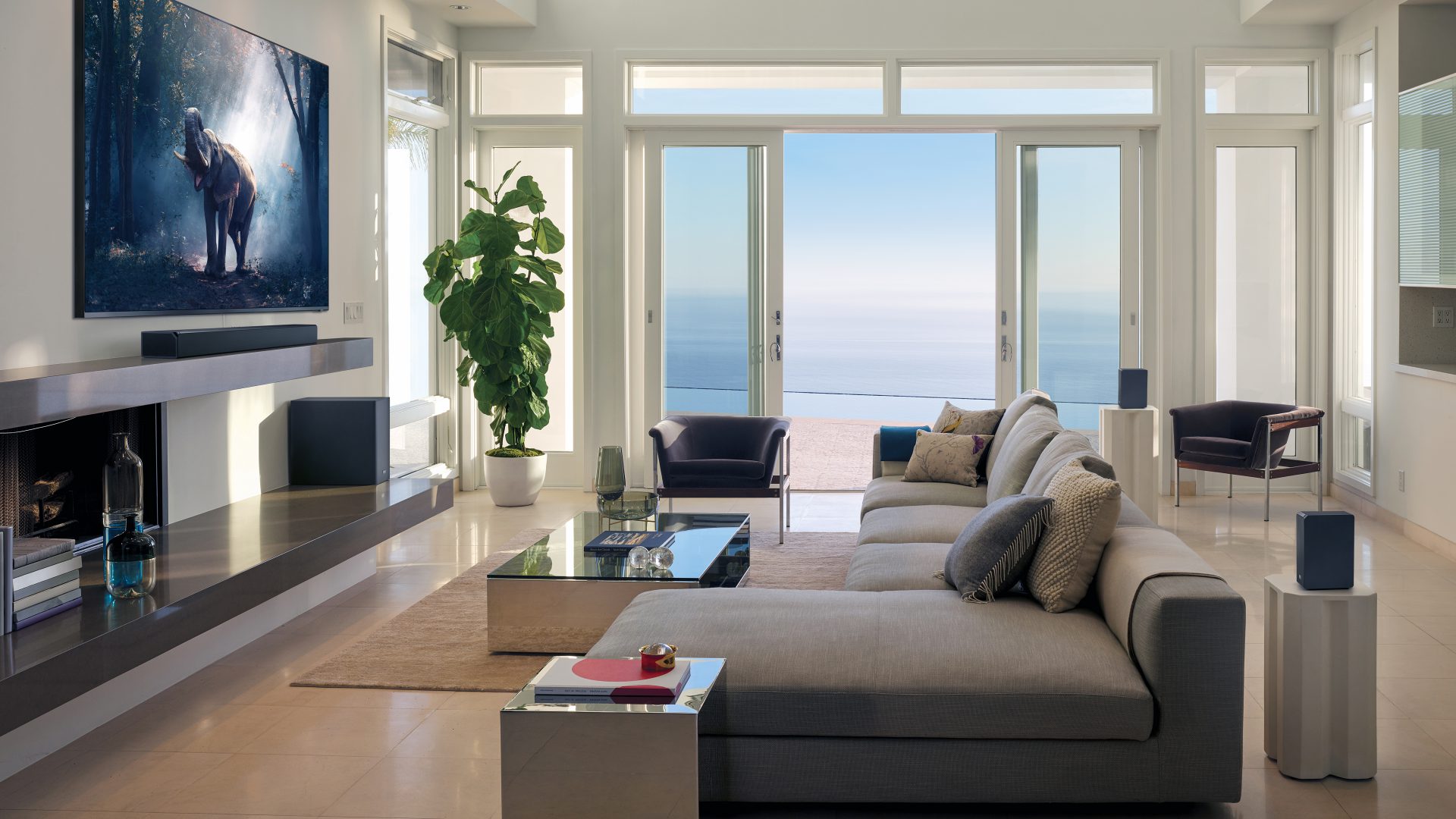 Separate baghøjttalere giver ægte surround-lyd. Her får du også et rigtig godt indtryk af Atmos-lydeffekter fra loftet. (Foto: Samsung)