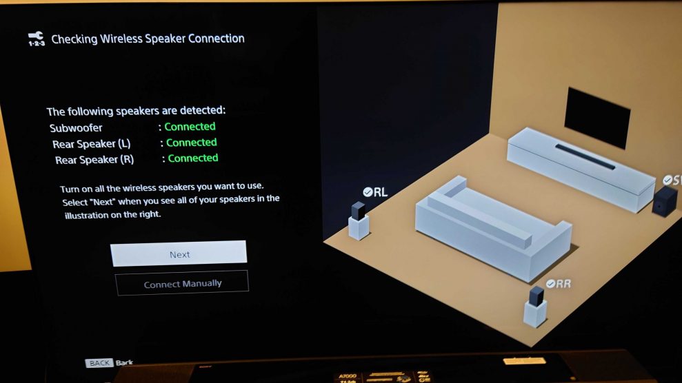 Når man sætter Sony-soundbaren op første gang, vil den lave nogle målinger for at optimere lyden til det rum, den står i. Soundbaren sender så nogle testsignaler ud og opfanger efterklangen via indbyggede mikrofoner. Her er det altså ikke nødvendigt at vifte med telefonen, som Sonos f.eks. kræver med deres Trueplay-korrektion. Opsætningen er overstået på få minutter.