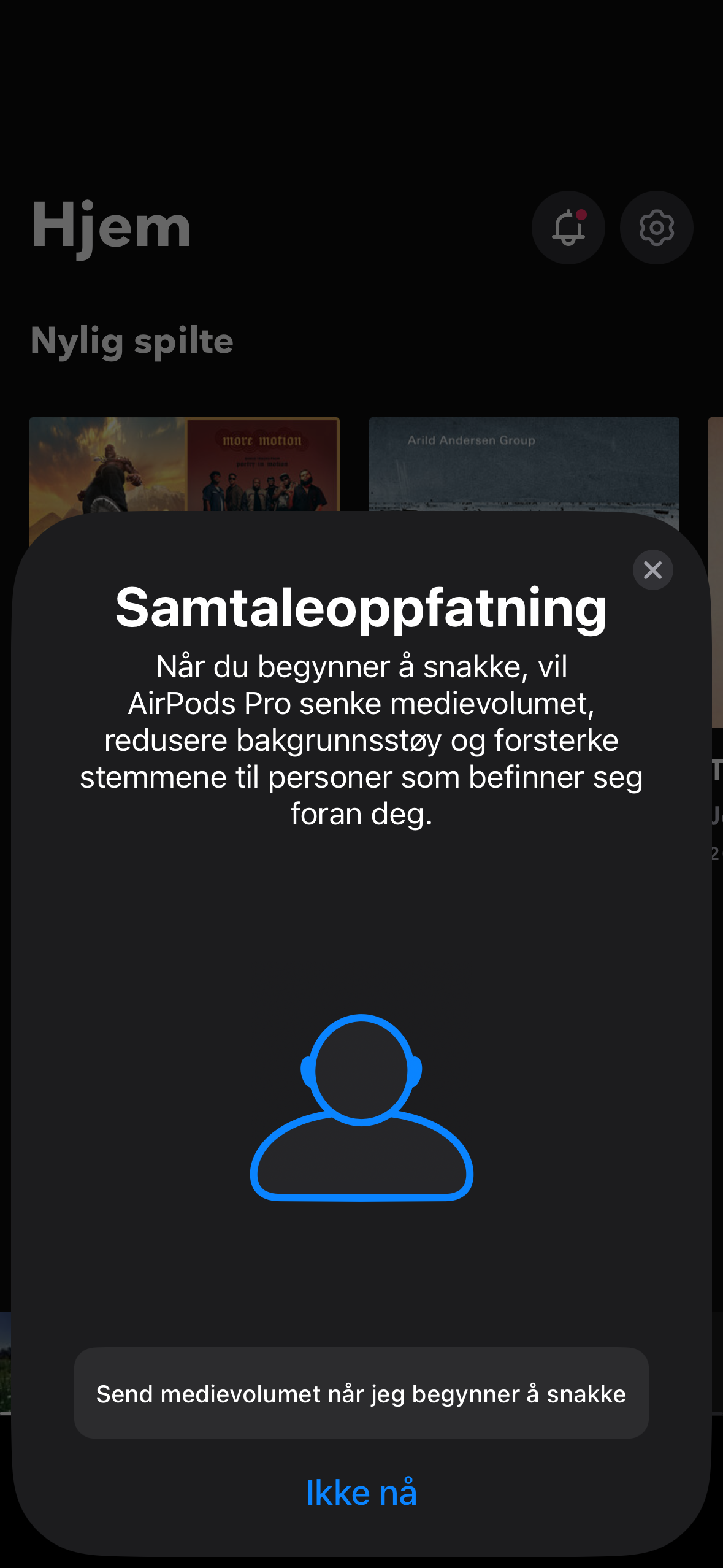 Transparent lyd, dvs. at man slukker for musikken og aktiverer mikrofonen for at høre, hvad folk i nærheden siger, behøver ikke at blive aktiveret i app’en eller ved at tappe på stilken på høreproppen. Apple kalder det Conversation Awareness eller opmærksomhed på tale; vi kalder det automatisk lyttefunktion, og det kan aktiveres i iOS 17 på mobilen, som automatisk slår musikken fra, når man begynder at tale.