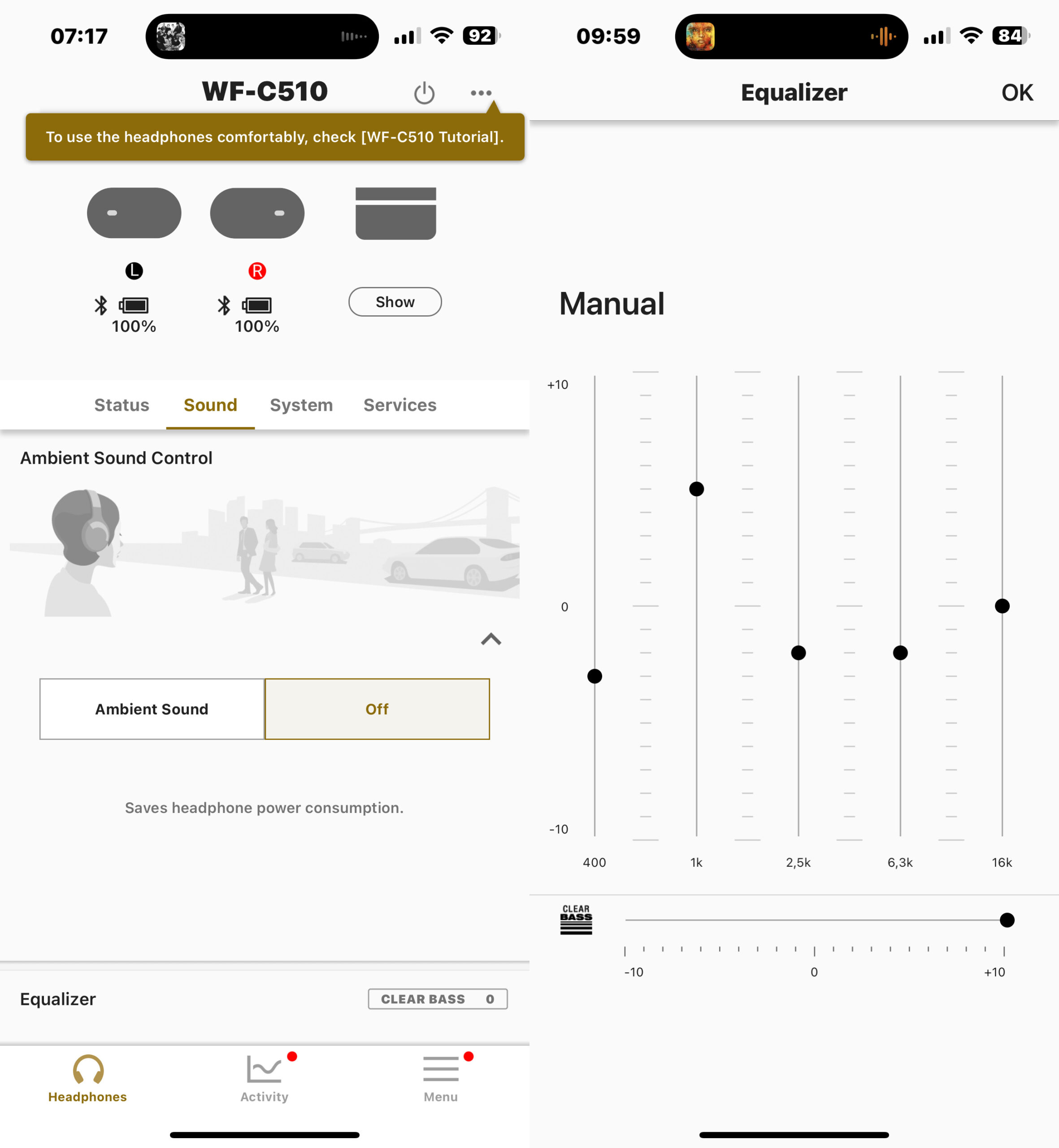 En stor fordel er, at hørepropperne kan tilpasses via Sonys Headphones-app. Her finder du en 5-bånds equalizer plus basjustering, som giver dig mulighed for at finjustere lyden efter din smag. Jeg endte med at justere lidt ned i områderne 2,5 kHz og 6,3 kHz for at reducere en smule skarphed, mens jeg øgede lidt ved 1 kHz for at øge klarheden i vokalregisteret. Jeg trak lidt ned ved 400 Hz for bedre at adskille bas og mellemtone og kompenserede ved at trække op i basregisteret (Crystal Bass) for at få mere fylde.