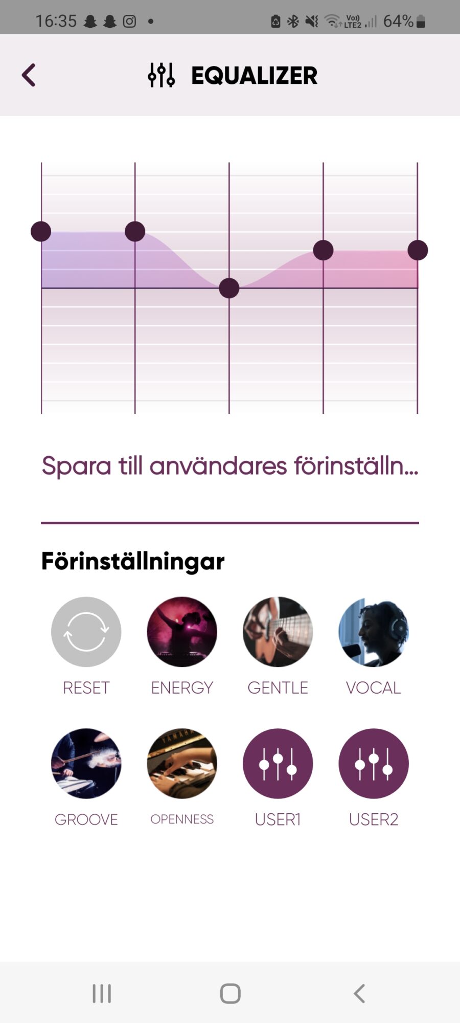 I app’en kan du vælge mellem forskellige lydbilleder ved at ændre EQ-indstillingerne. Dels ud fra hvilken musik, du lytter til for tiden, dels hvad du selv foretrækker og synes om. Forudindstillingerne hedder Energy, Gentle, Vocal, Grove og Openness. Derudover er det muligt at skræddersy to indstillinger, som kan navngives.