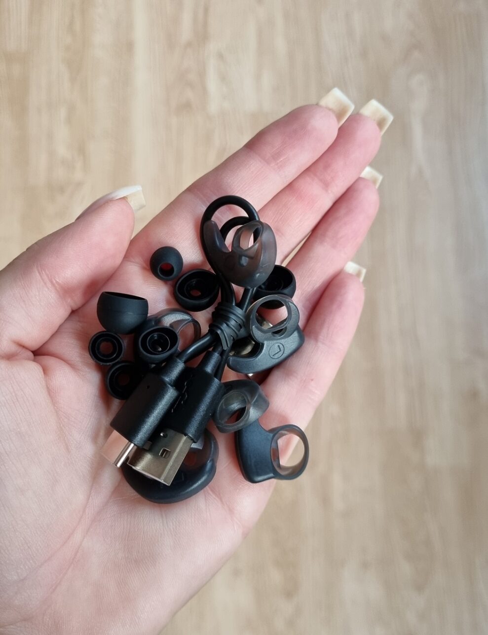 Min mistanke forstærkes, når jeg finder tilbehøret frem. På emballagen kan jeg læse, at der er et opladningskabel samt i alt fem øredutter og fire vinger i varierende størrelser. Jeg finder dem i en sort kartonpose og tapet sammen med almindelig tape… Jeg krydser fingre for, at det kun er mit prøveeksemplar, der er så uheldigt præsenteret. Det føles ikke helt rigtigt at købe et par hørepropper til næsten 1.400 kr. og så få tilbehøret hulter til bulter i en pose.