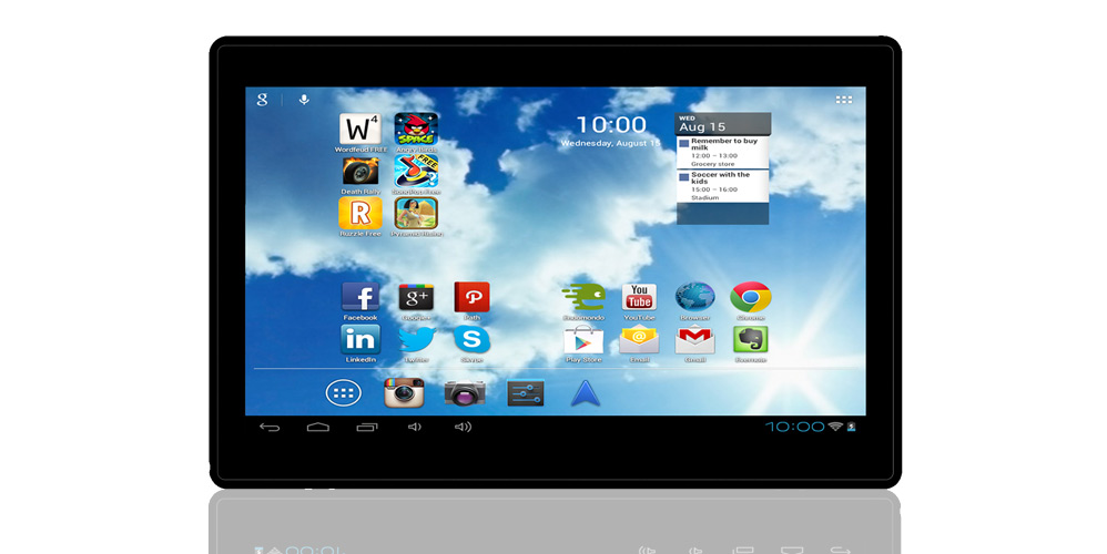 Skærmen er ikke ligefrem nogen retina-skærm. Med en opløsning på 1024 x 600 punkter rummer denne 10 tommers skærm kun en femtedel så mange punkter som de mest højopløste i samme størrelse. Retfærdigvis er prisen også en femtedel. Skærmen overrasker desuden ved at være 10-punkts multitouch i stedet for 5-punkts som de øvrige. Indbygget GPS og 1,9 megapixel kamera undergraver også fordommene om billige produkter.