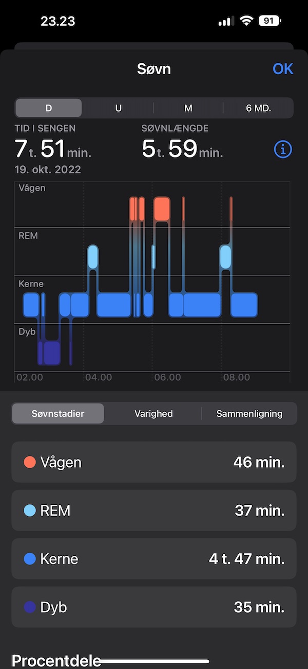 Selvfølgelig er Apple Watch Ultra også spækket med diverse sundhedsfunktioner. Herunder automatisk genkendelse og registrering af fysisk aktivitet, faldregistrering, EKG, iltniveau i blodet, søvnregistrering samt en ny temperatursensor, som dels hjælper kvinder med at måle og følge med i deres menstrationscyklus (hvilket jeg af gode grunde ikke har kunnet teste!) og dels generelt måler din temperatur om natten, hvis du har uret på armen, mens du sover.