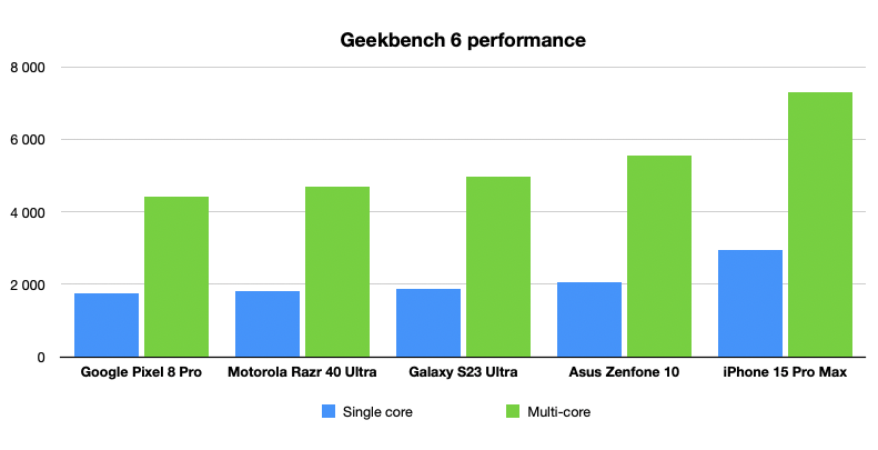 Sammenlignet med den tidligere model er den rå ydelse, målt med Geekbench, øget med 15-20 procent, hvilket er sammenligneligt med den tidligere ydelsesfremgang. Grafikydelsen er øget med imponerende 37 procent, men det er fra et lavt niveau, så vi kan sige, at den begynder at hale ind på konkurrenterne. Den overordnede ydelse, målt med Antutu 10, fortæller os, at ydelsen er steget med hele 29 procent. Men det bringer den kun op på niveau med sidste års Samsung Galaxy S22 Ultra. Sammenlignet med dette års topmodeller halter den bagefter, men som sagt er det heller ikke meningen, at den skal være hurtigst. Ifølge Geekbench ML er maskinlæringsydelsen dog forbedret med hele 41 procent, hvilket Google siger, at de har sigtet efter.