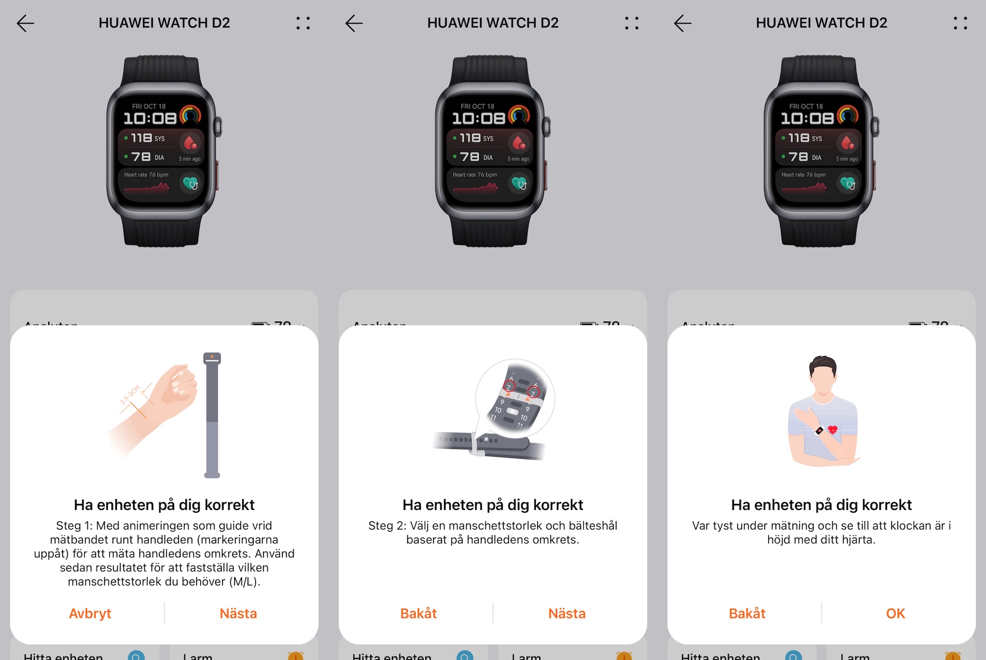 Så kommer vi til det centrale element, som er blodtryksmålingen. Til de enkelte målinger er der detaljerede instruktioner om, hvordan uret skal sidde på håndleddet, præcis hvordan man skal holde armen, støtte den, placere uret, og hvordan man skal holde hånden. Hvis man følger dette, må vi sige, at målingerne er fuldt ud acceptable. Da vi testede blodtryksmålere, afveg de kun med nogle få procent, og Watch D2 afviger ærligt talt mere. Men for noget, der måler på håndleddet, er det stadig over vores forventninger. Vi ville ikke stole på den nøjagtige værdi, men uret kan uden tvivl afgøre, om du har lavt, normalt eller højt blodtryk.