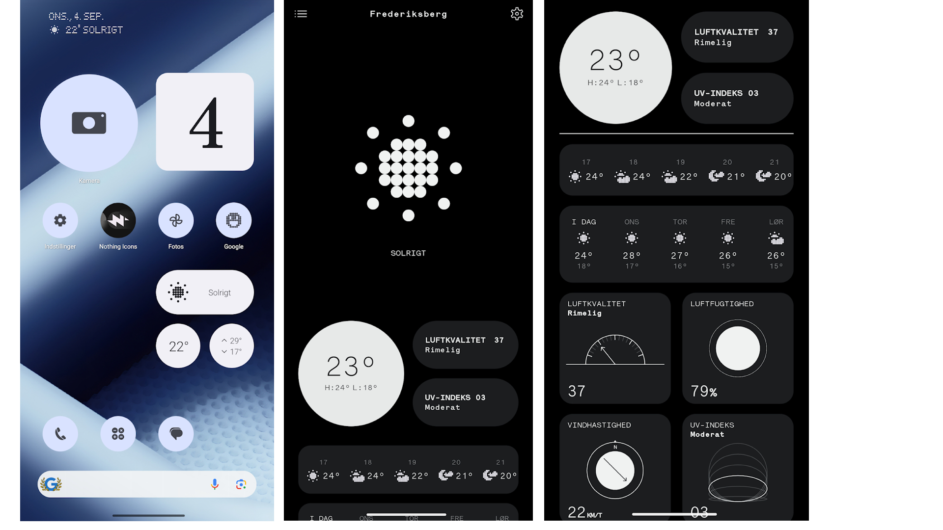 Mikset mellem de to styresystemers stilart er delvis vellykket. Android-apps vil gerne blande sig. For eksempel vejr-app’en, som giver daglige notifikationer om vind og vejr i typisk (farverig) Android-stil. Bruger du Nothings vejr-app, for eksempel som widget på skærmens forside, er indholdet noget mere afdæmpet at se på.