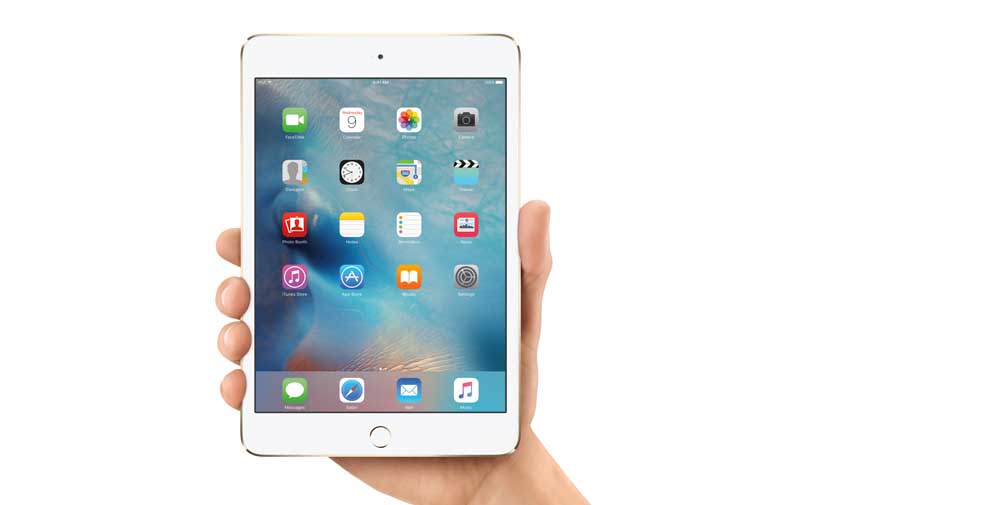 Og så til 4’eren. Den har samme skærmstørrelse og opløsning som iPad mini 2 og 3, og fås ligesom disse med enten 16, 64 eller 128 gigabyte lager. Touch ID har den også. Men processoren er blevet opgraderet til A8 + M8 – som der også sidder i iPhone 6 og iPhone 6 Plus – mens hukommelsen nu er på 2 gigabyte ram.