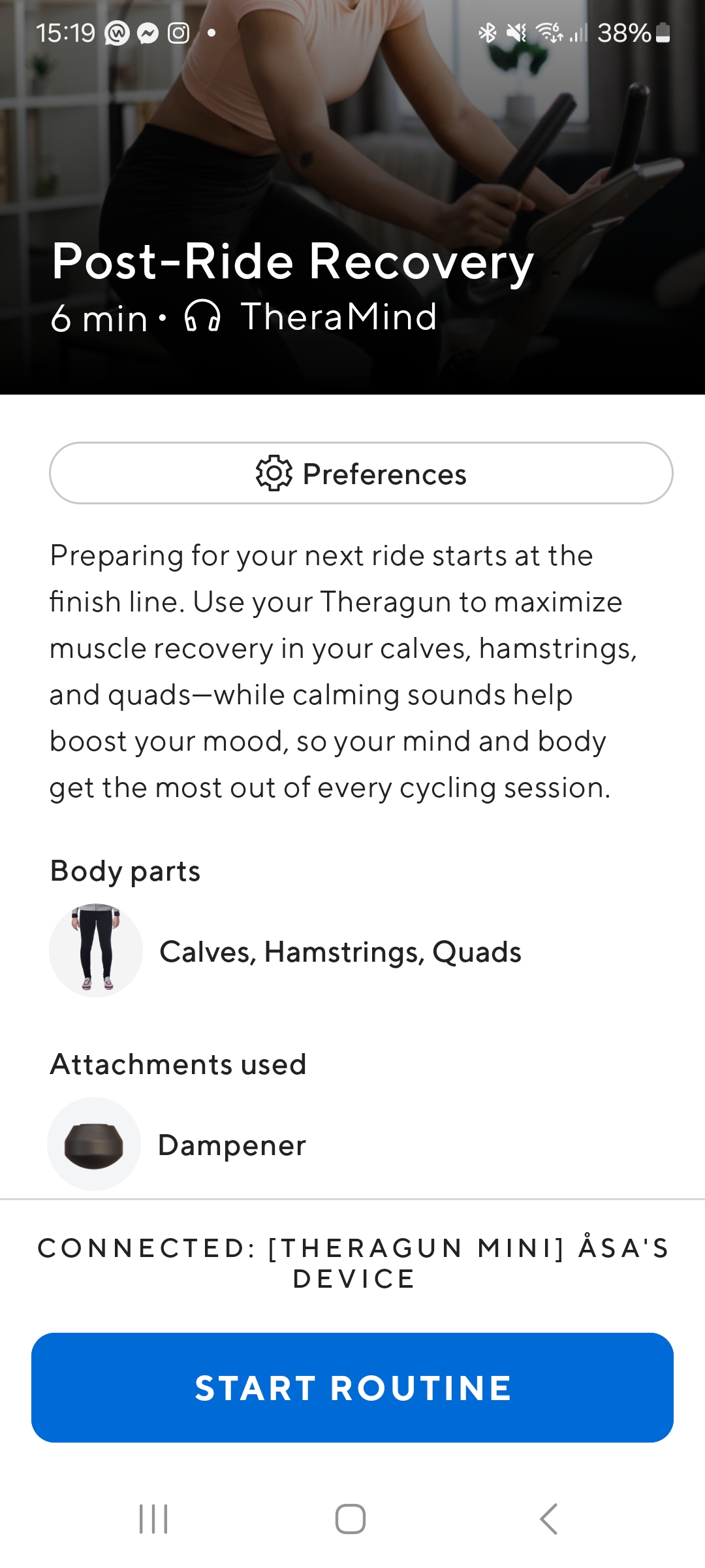 Jeg sætter stor pris på Therabody-app’en. Den har skræddersyede programmer, som guider mig til, hvordan og hvor jeg skal massere for f.eks. at varme min krop op til en bestemt type træning. Eller hvordan jeg kan hjælpe mine muskler med at restituere efter en spinningtime. Det er tydeligt angivet, hvilket massagehoved der er relevant. Intensiteten reguleres automatisk, og der vises også en film for at gøre det lettere for mig at følge med. Hvor lærerigt!