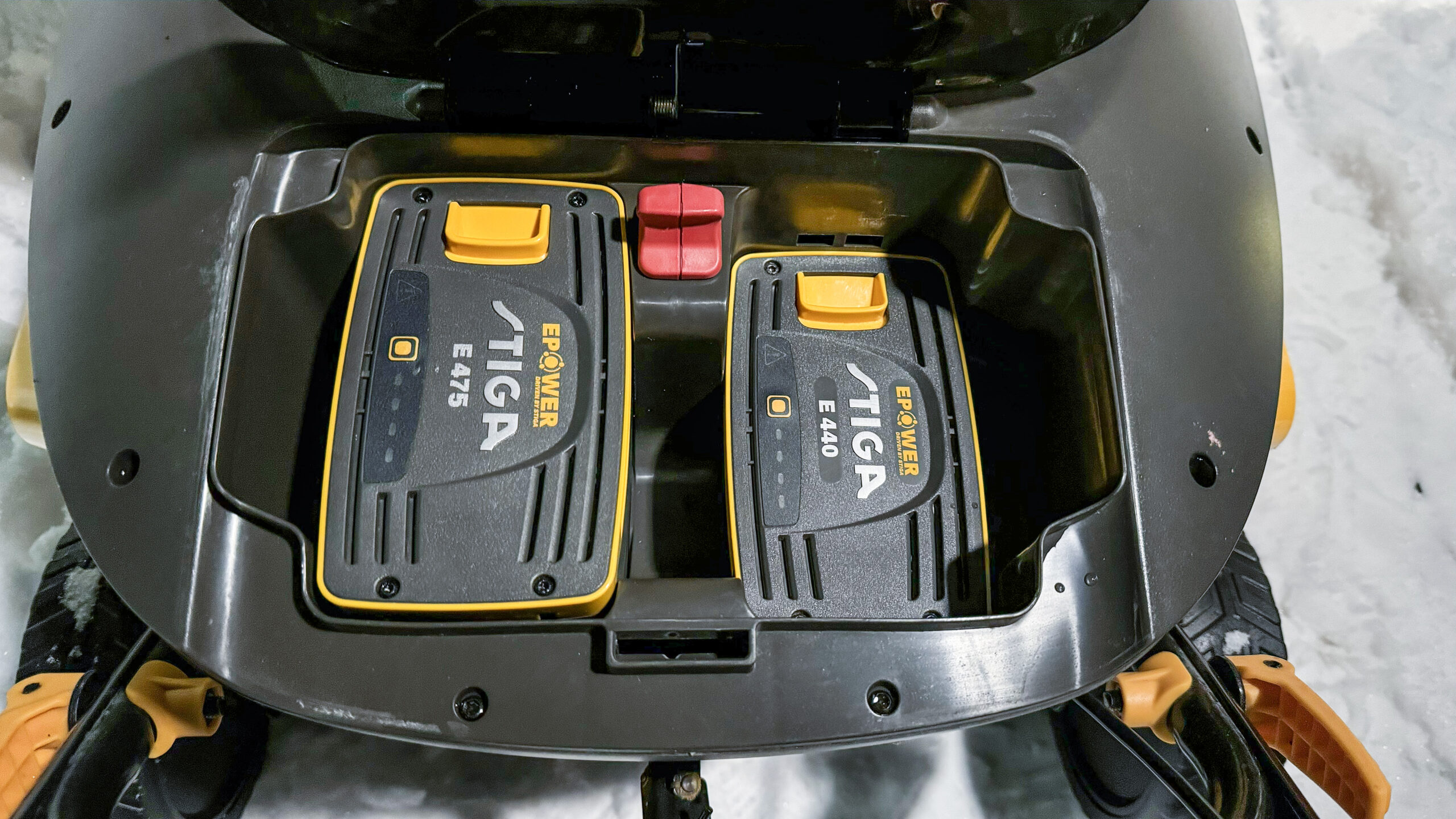 Sneslyngen kan rumme op til to batterier på samme tid, hver med en kapacitet på op til 7,5 Ah. Jeg har fået leveret både 4 og 7,5 Ah til test, og med begge batterier fuldt opladet kan jeg nok rydde omkring 1.000 kvadratmeter nysne, før begge batterier løber tør. I hverdagen har jeg aldrig oplevet, at jeg ikke kunne rydde den sne, jeg havde brug for, før jeg skulle oplade.