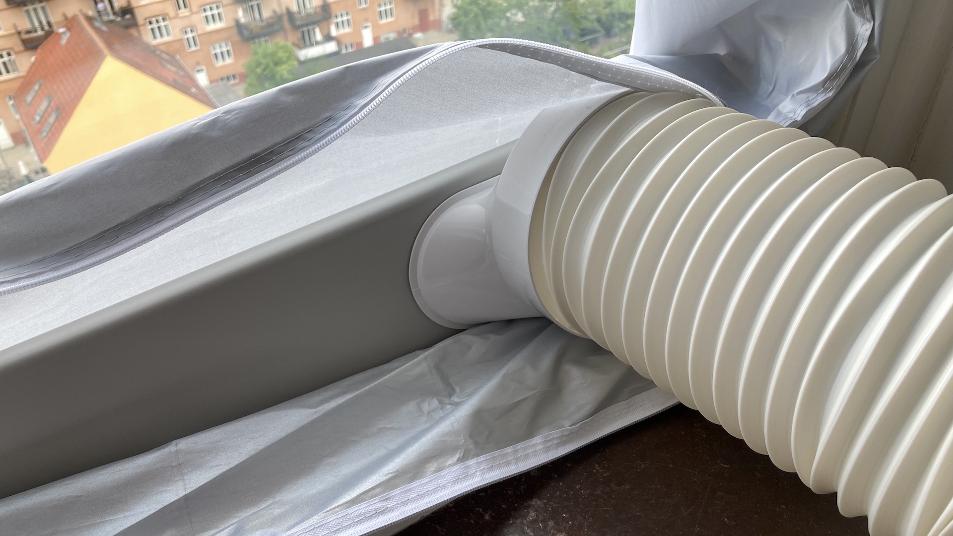 For at holde slangerne på plads blev de sat fast i et beslag med huller i. Beslaget blev sat ned i sprækken i det halvåbne vippevindue. Opsætningen er ikke strengt nødvendig, men giver en bedre effekt. Ifølge Electrolux op til 28 procent i forhold til, hvis du køler uden en forsegling.