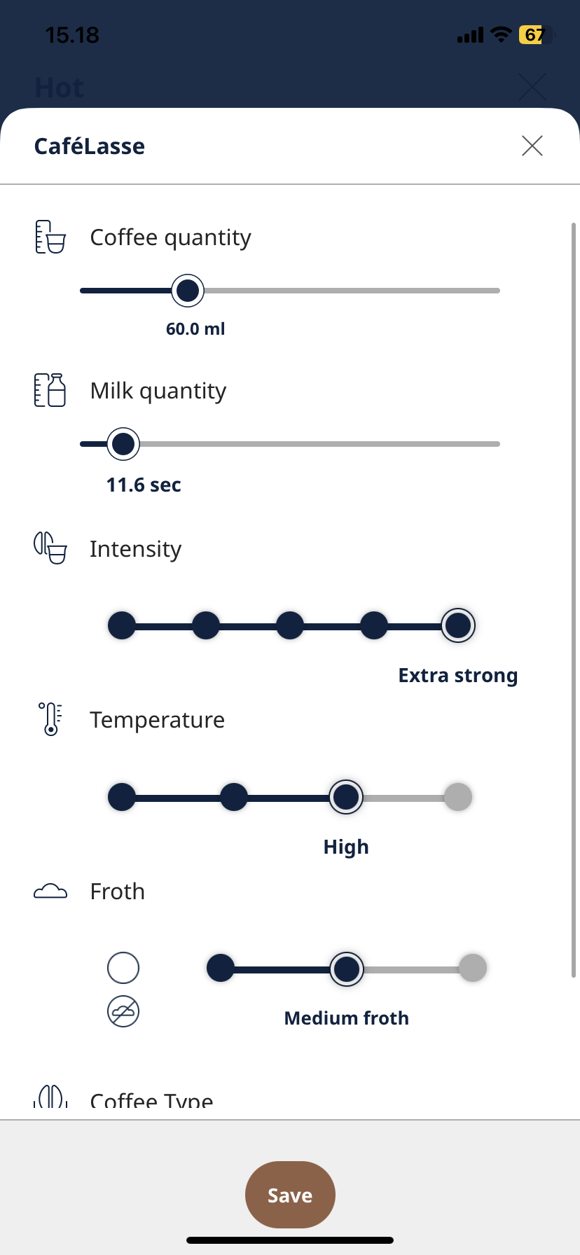 Delonghis app Coffee Link byder på en blanding af klassisk fjernstyring og inspiration til nye opskrifter fra deres blog. Ligesom hos Siemens og Jura kan man også opbygge egne opskrifter fra bunden. Det er især brugbart med Maestosa. Ikke fordi man får mange nye funktioner, men fordi indstillingerne er mere gennemsigtigt opbyggede i app’en. Her kan man vælge den præcise mængde kaffe i milliliter, i stedet for på en lille skala. Man må dog stadig døje med skalaerne, når man indstiller intensitet, temperatur og mælkeskum. Du kan naturligvis få maskinen til at brygge din nye kaffeopskrift, ved at bruge app’en.