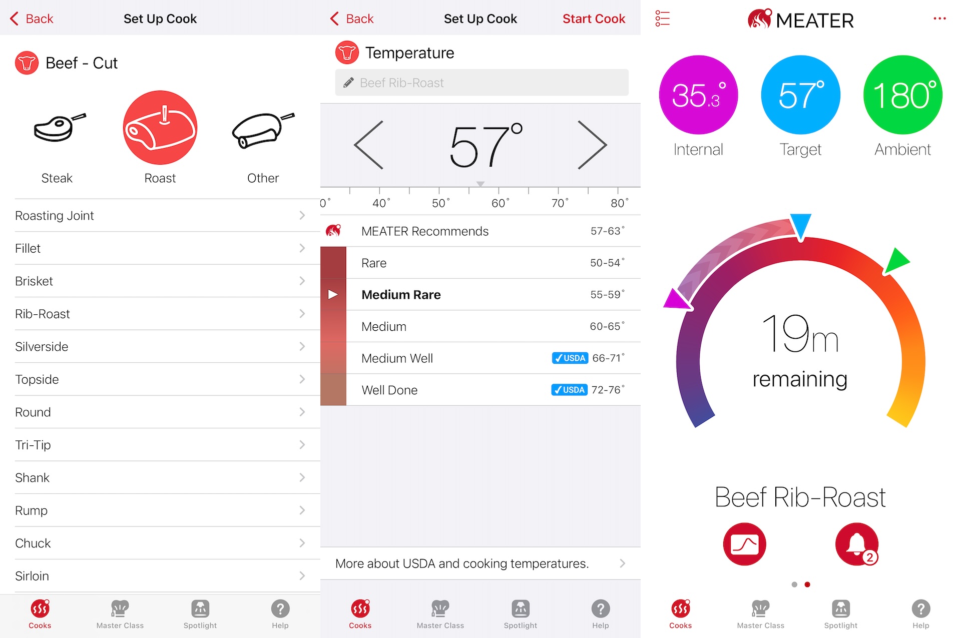 I app’en kan man vælge, hvilken hovedtype af protein man vil tilberede. Okse, svin, fjerkræ, lam, fisk eller mere eksotiske råvarer. Derefter kan man vælge, om man vil tilberede en skive, en hel steg eller andre udskæringer. Derefter vises der underkategorier, hvor der f.eks. er hele 30 at vælge mellem for oksekød. Derefter tilberedningsmetoden: Ovn, kul- eller gasgrill, BBQ-røg, airfryer eller frituregryde. Endelig er der tilberedningsgraden fra rare til well done, hvor de anbefalede temperaturer stemmer overens med, hvad kogebøger normalt anbefaler. Man kan også indstille timere eller alarmer, hvis forskellige begivenheder indtræffer.