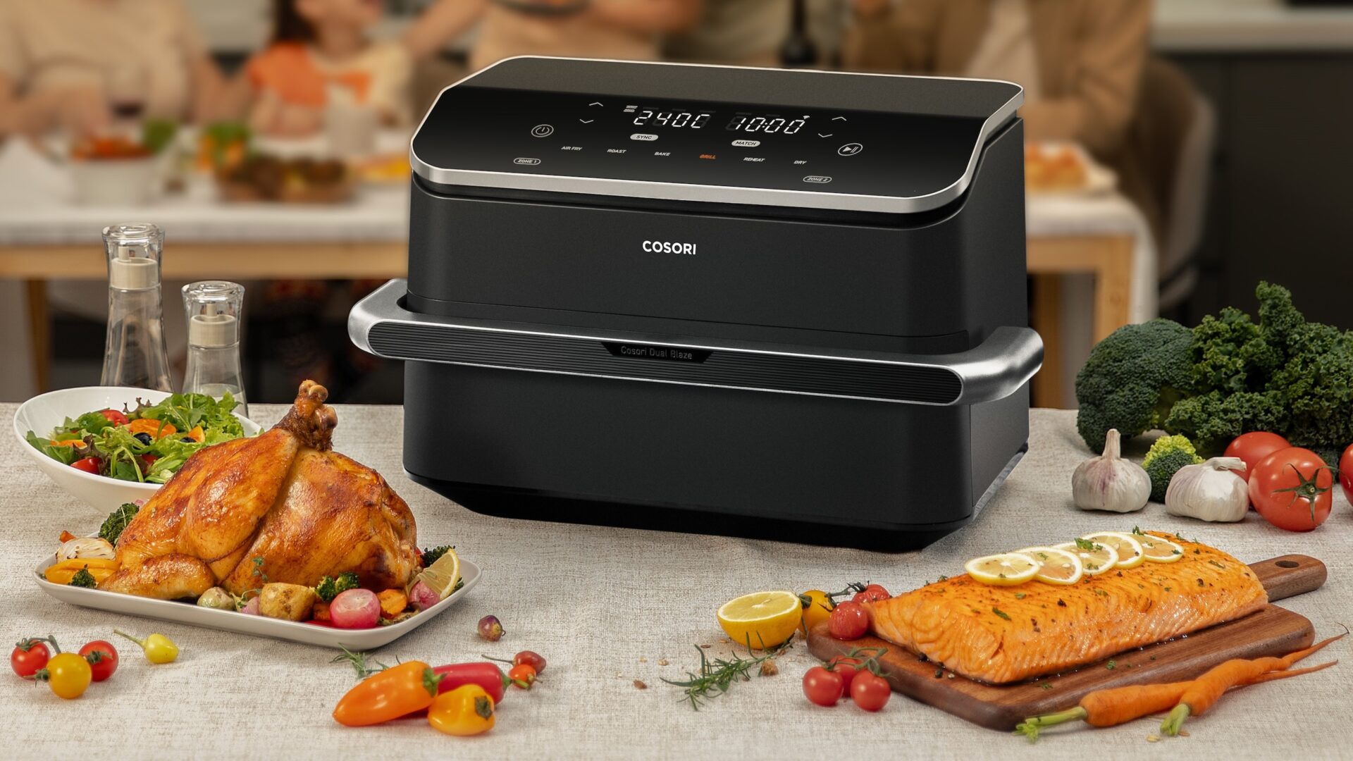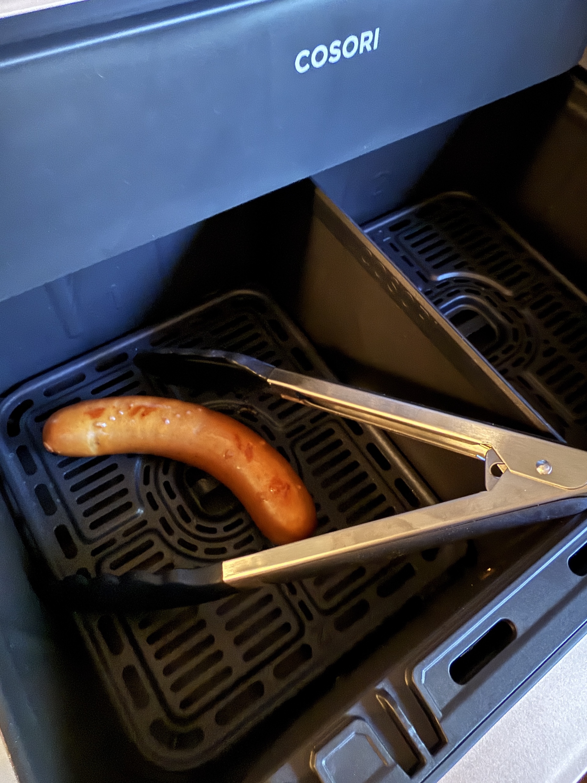 Amerikanske Cosori har et bredt udvalg af køkkenmaskiner i sit hjemland, mens vi i Skandinavien må nøjes med de mest populære airfryer-modeller. Den nye importør er dog begyndt at tage nogle andre typer apparater ind, så det kan være, at det er ved at ændre sig. Dual Blaze TwinFry leveres med en praktisk grilltang med silikonegreb og, ud over brugsanvisningen, en mere pædagogisk quick guide. Du kan også scanne en QR-kode for at få opskrifter, men i skrivende stund virkede de skandinaviske sider ikke. En trådkurv fås som tilbehør, når du har brug for ekstra luftgennemstrømning.