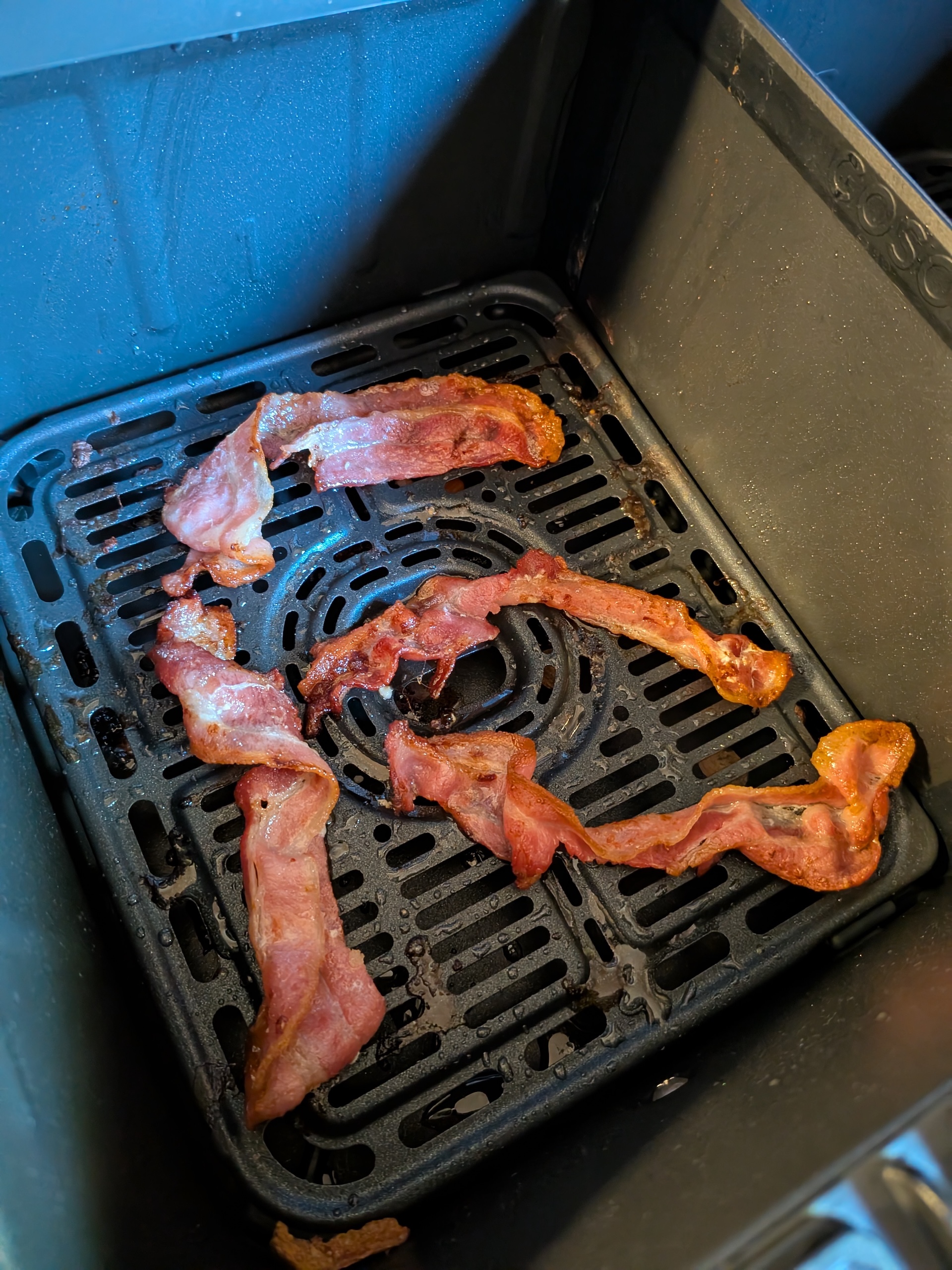 Standardindstillingen i airfryer-tilstanden er 200 grader i 20 minutter, men som sagt kan du selv ændre den. Den ene kurv nåede 180 grader på 2 minutter og 40 sekunder, hvilket er hurtigt, men fortsatte derefter med at stige til 190 grader, før den begyndte at svinge mellem dette og 176 grader. Den anden kurv nåede 175 grader efter 3 min. 20 sek. og blev der i et par minutter. Efter et stykke tid stabiliserede begge kurve sig dog lige over 180 grader, så de får stadig et pas. I daglig brug føles den forudsigelig, så vi havde ingen problemer med at få bacon, pølser og æggeretter, præcis som vi ville have dem.