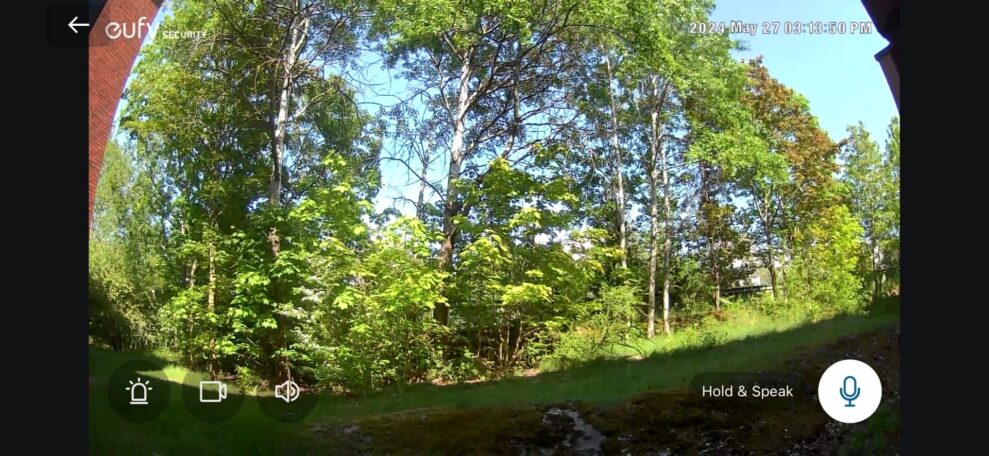 Overordnet set var vi meget tilfredse med EufyCam’s videokvalitet, og takket være 2K-sensoren blev selv små detaljer fanget. Det skal bemærkes, at kameraet har et fiskeøjeobjektiv, hvilket betyder, at selvom du får en meget bred vinkel, er billedet forvrænget. I nattilstand får du sort-hvid video takket være en IR-lampe, men der er faktisk ikke noget spotlys, hvis du vil se bedre eller optage farvevideo af en ubuden gæst.