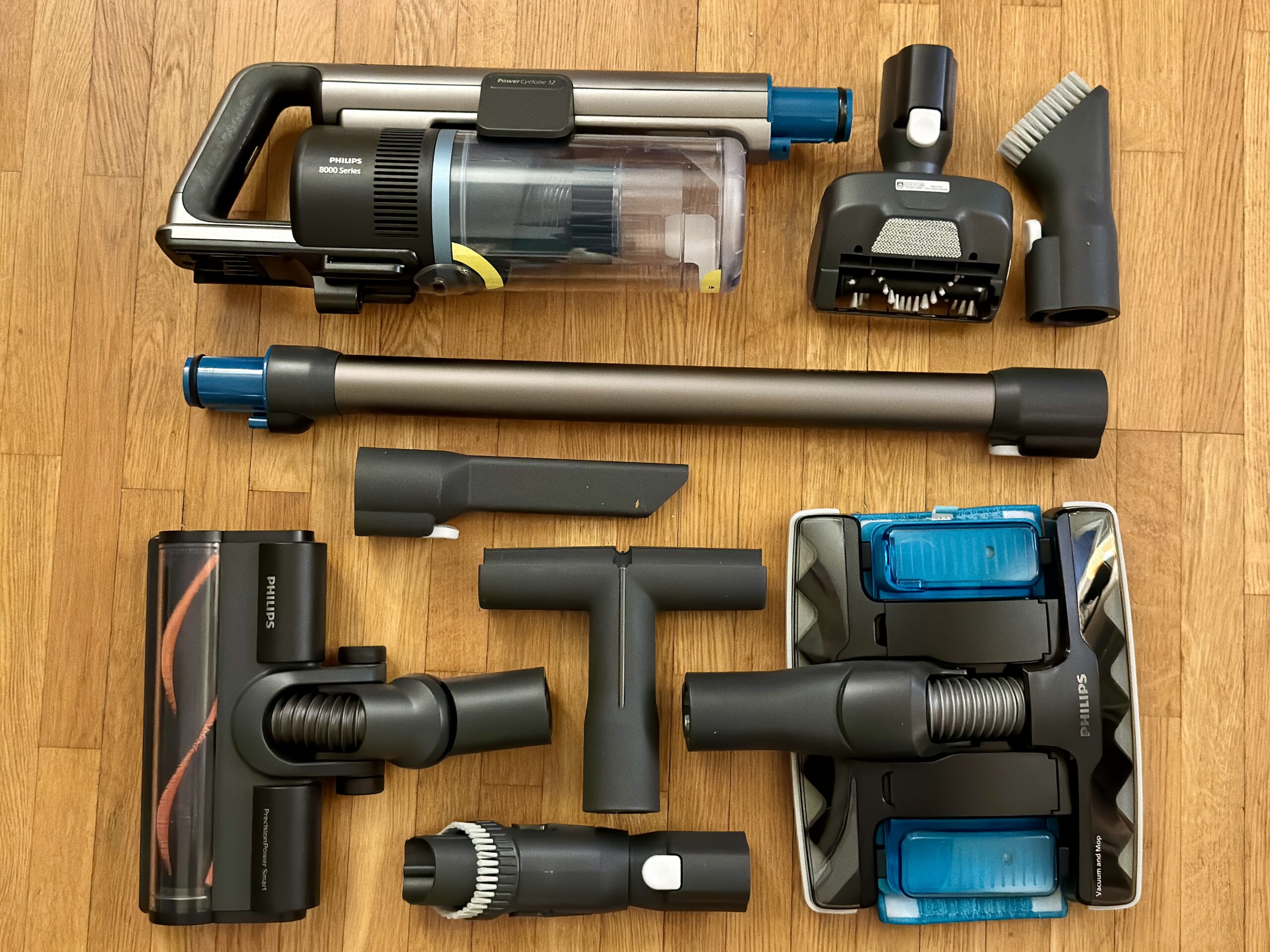Det skorter ikke på tilbehør til Philips’ støvsugere. Vi får et motoriseret mundstykke med roterende børster, som burde fungere på både hårde gulve og tæpper. Derudover er der et lille motoriseret mundstykke, “miniturbobørsten”, til at fjerne dyrehår fra sofaer, senge og andre polstrede møbler. Alternativt et polstermundstykke til skånsom støvsugning af møbler. Et smart kombinationsmundstykke til afstøvning, som kan bruges med eller uden børste og en blød børste til sarte overflader, og et smalt mundstykke til trange rum. Og så er der det flotte kombinerede støvsugnings- og moppemundstykke. Vi kan også godt lide, at der følger en ekstra moppepude med. Vi er mindre imponerede over det simple vægbeslag af plast til fastgørelse af opladningskablet. Der er ikke engang noget beslag til tilbehøret, som man er nødt til at lægge i en skuffe i rengøringsskabet.
