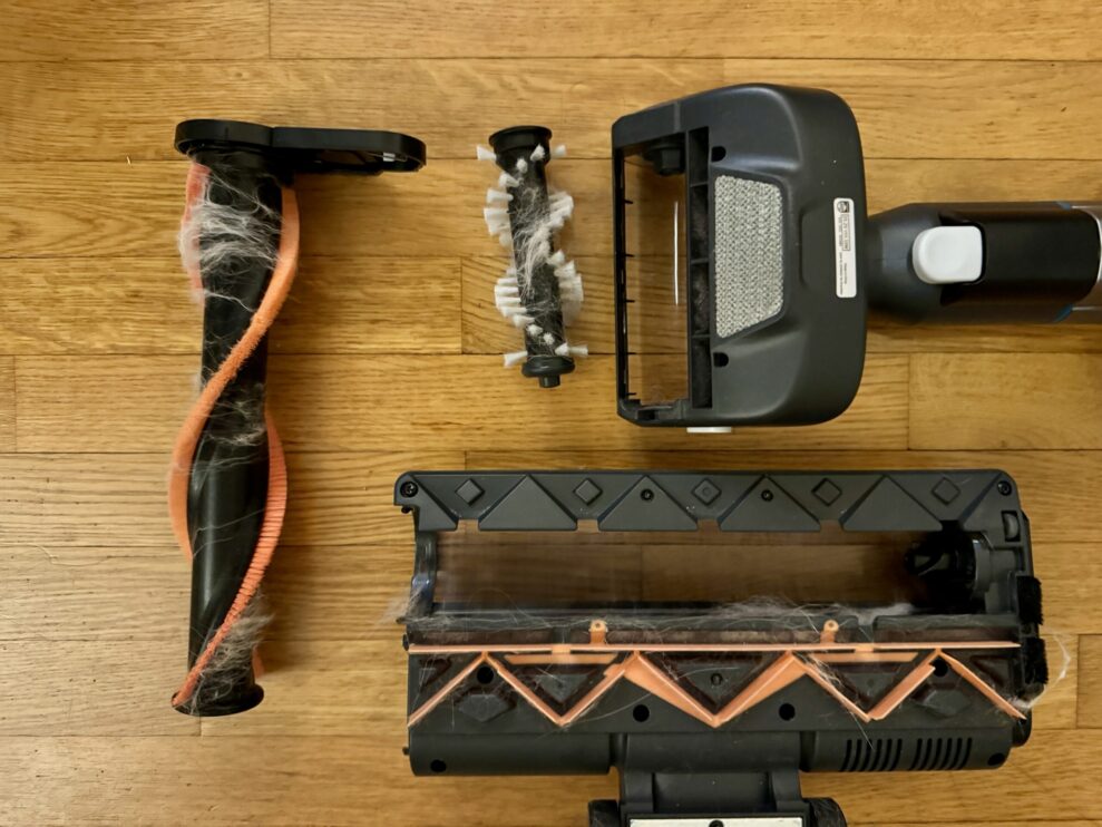 For en gangs skyld behøver du ikke en ingeniørgrad eller et særligt håndelag for at tømme støvbeholderen. Du skal bare trykke på en knap for at frigøre den og trække filteret lige ud. Da beholderen ikke har nogen krinkelkroge, kan du faktisk bare tømme den i skraldespanden, og vi behøvede aldrig at gå ned og grave noget ud, der sad fast. Filteret kan vaskes under vandhanen, når det er nødvendigt. Ingen af de motoriserede mundstykker havde større problemer med hår, der satte sig fast, men hvis det sker, er det bare at løsne rullebørsten med et enkelt håndledsbevægelse. Perfekt!