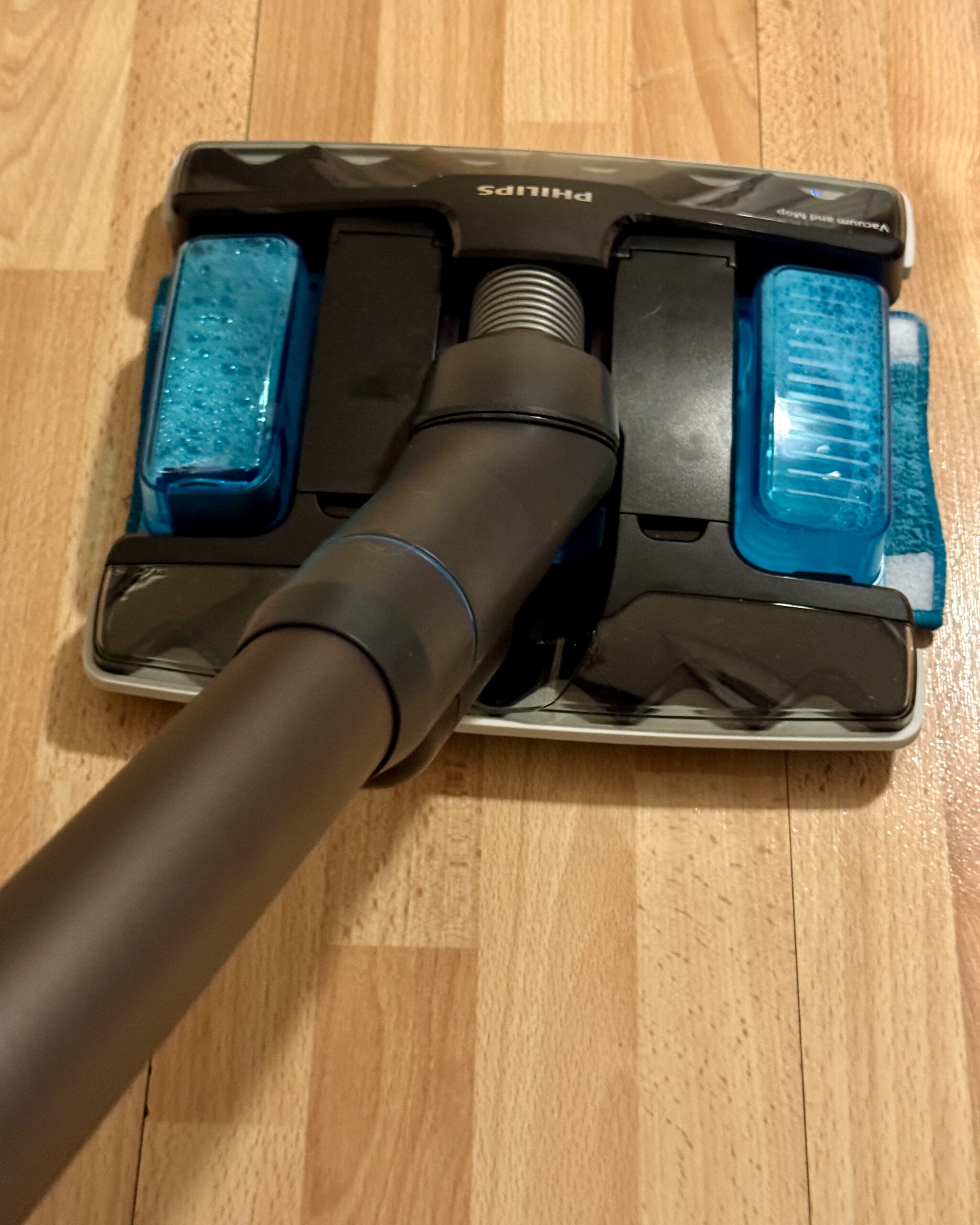 Det betød faktisk mindre, fordi vi alligevel foretrak at bruge moppemundstykket. Det unikke er, at det også støvsuger. Både før og efter mikrofiberpuden er der mundstykker med gummiflanger, som faktisk støvsuger gulvet effektivt, og designet gør, at man kan trække frem og tilbage. Fra den lettilgængelige vandtank, som man for en gangs skyld kan putte rengøringsmiddel i, bliver puden konstant fugtet, og vi får en rengøring, der er lige så effektiv, som hvis vi brugte en vådmoppe. Bagefter smider man puden til vask. En enkel, funktionel og rengøringsvenlig løsning. Hører i efter, Dyson?