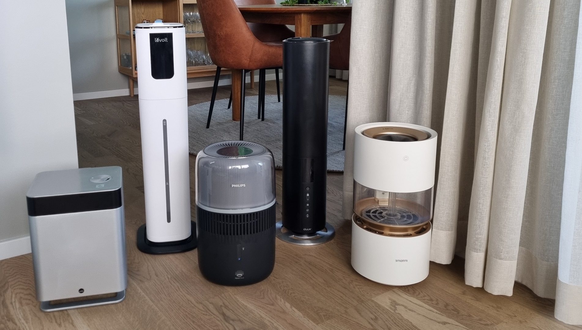 Holdopstillingen. Fra venstre: Wilfa Dew Humidifier HU1A-43C, Levoit OasisMist 1000S Smart Humidifier, Philips Luftfugter 500, Duux Beam Smart 2 luftfugter og Smartmi Rainforest Humidifier SM1019. (Foto: Åsa Warme Hallén/L&B Home)