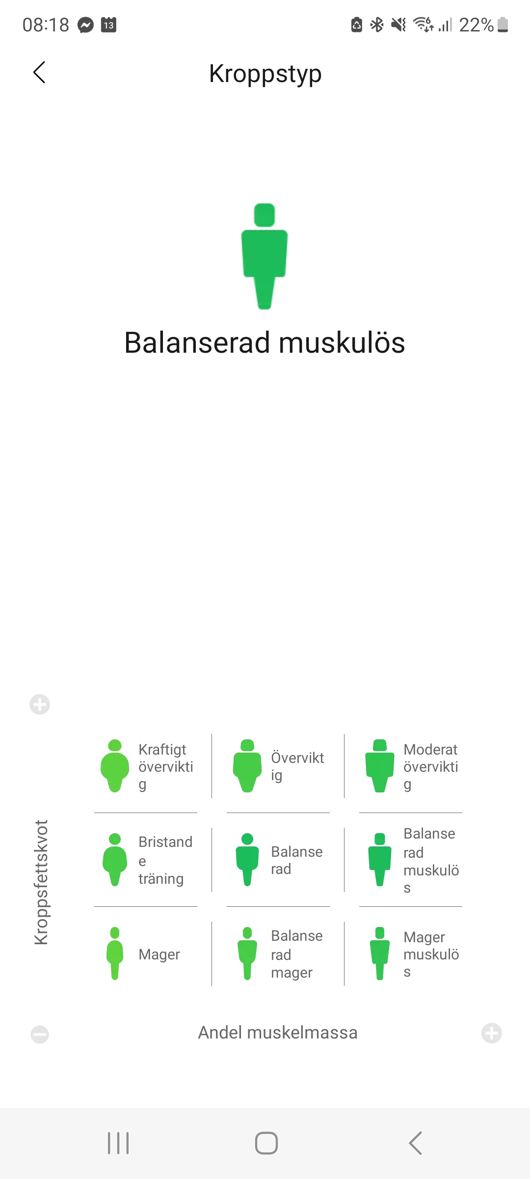 Efter vejningen får jeg en opsummering af min kropssammensætning. Her får jeg et overblik over, hvordan mine værdier er. (Skærmbillede fra app)