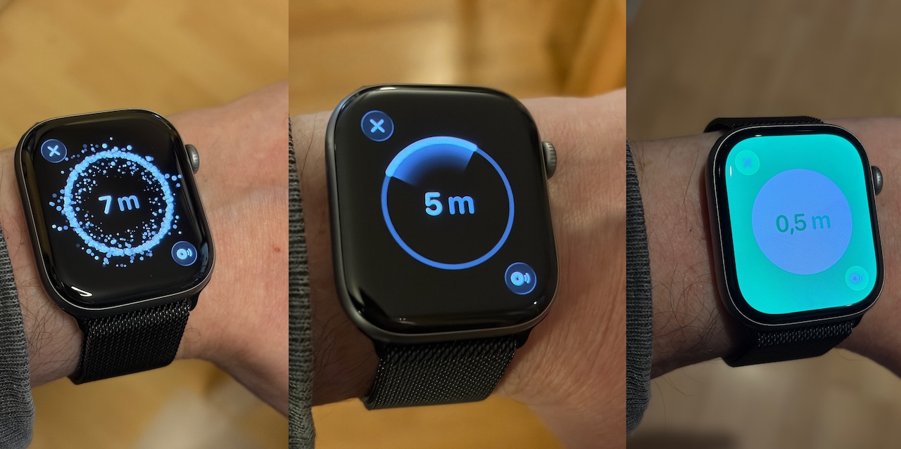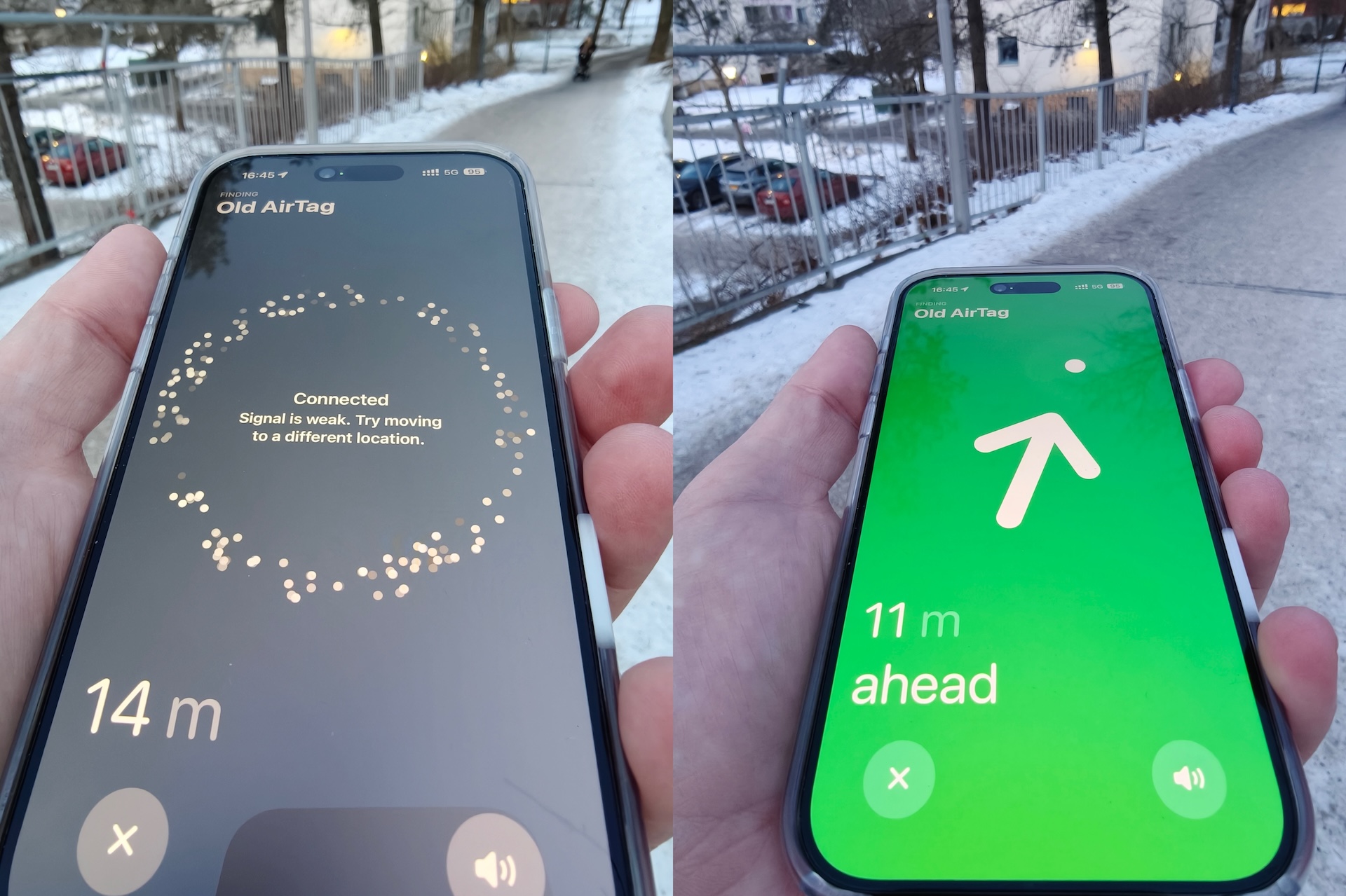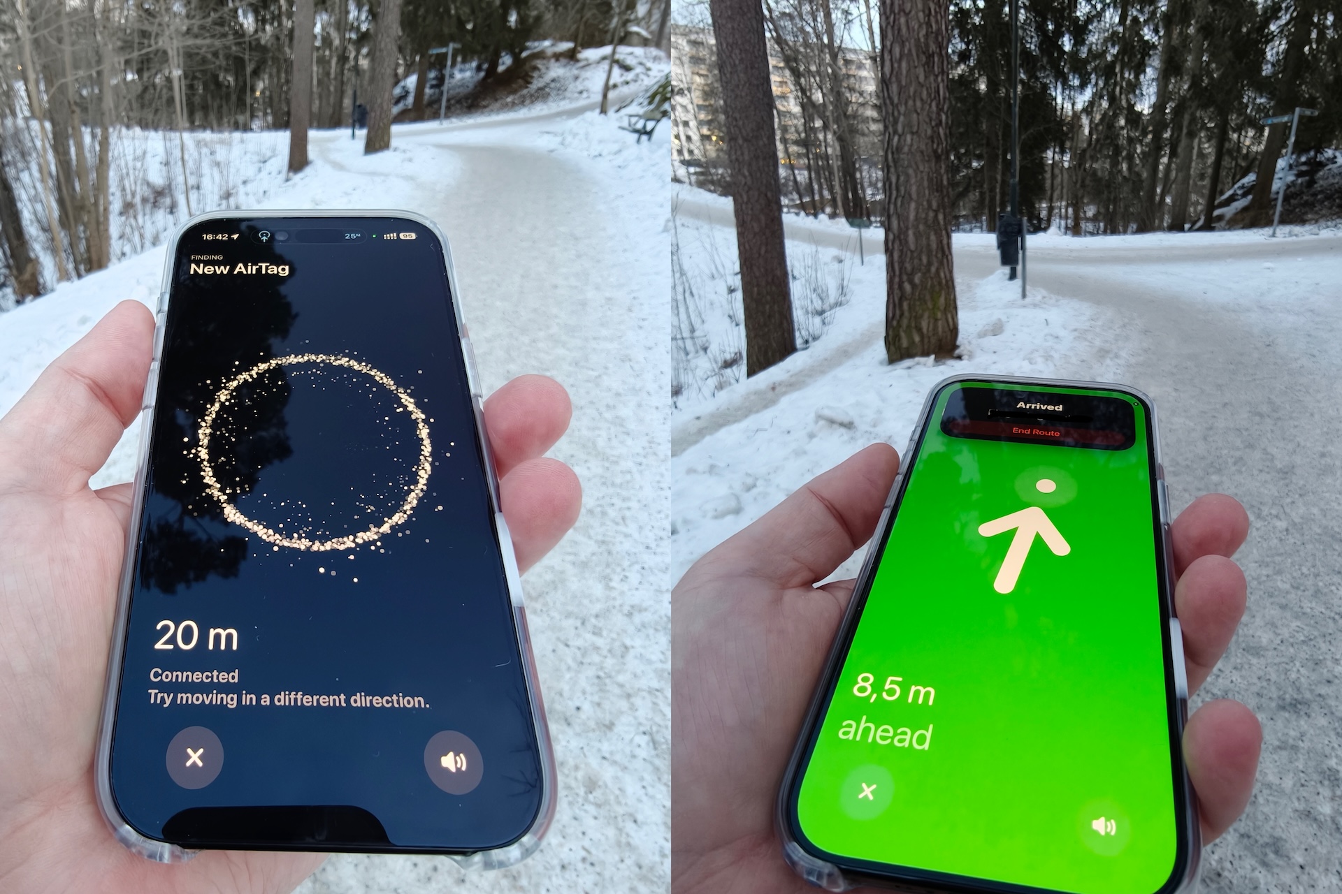 Det lyder måske som lang tid, men det var midt på dagen, og der var naturligvis ikke mange mennesker, der kom forbi. Tagsene var markeret omtrentligt på kortet. Da vi nærmede os, aktiverede vi Find-funktionen. Med den nye tag kunne vi opfange signalet fra en større afstand, og vi fik præcis vejledning med en pil på en større afstand. Med andre ord er det meget nemmere at finde den nye AirTag.