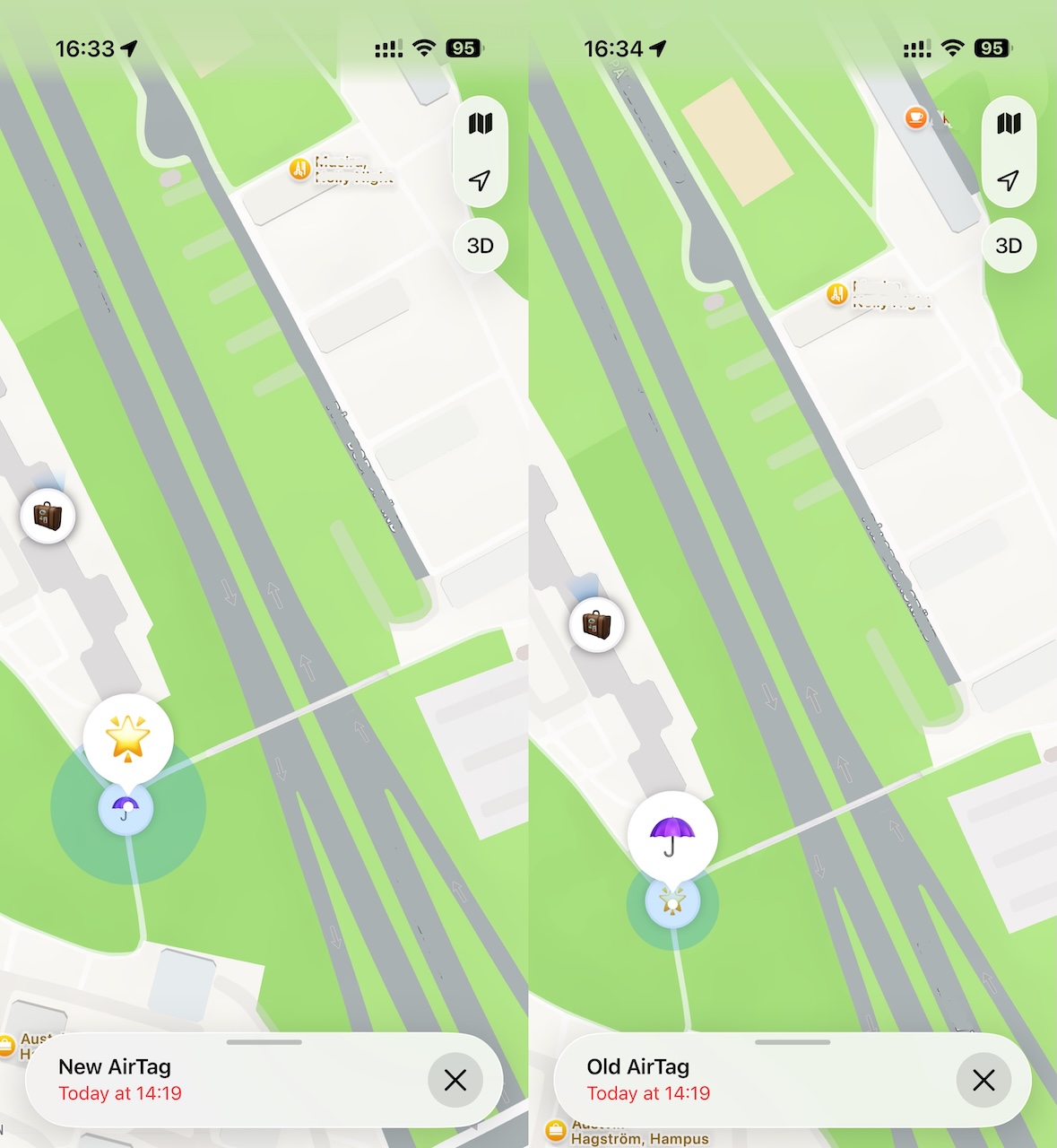 For at se, om der virkelig er en forskel mellem de gamle og nye AirTags, “mistede” vi en af hver. Det vil sige, at vi placerede dem langs en gangbro med 50 meters afstand. Derefter markerede vi dem som mistede. Efter en time pingede vores mobiltelefoner for at fortælle, at først den ene og derefter den anden var blevet fundet.