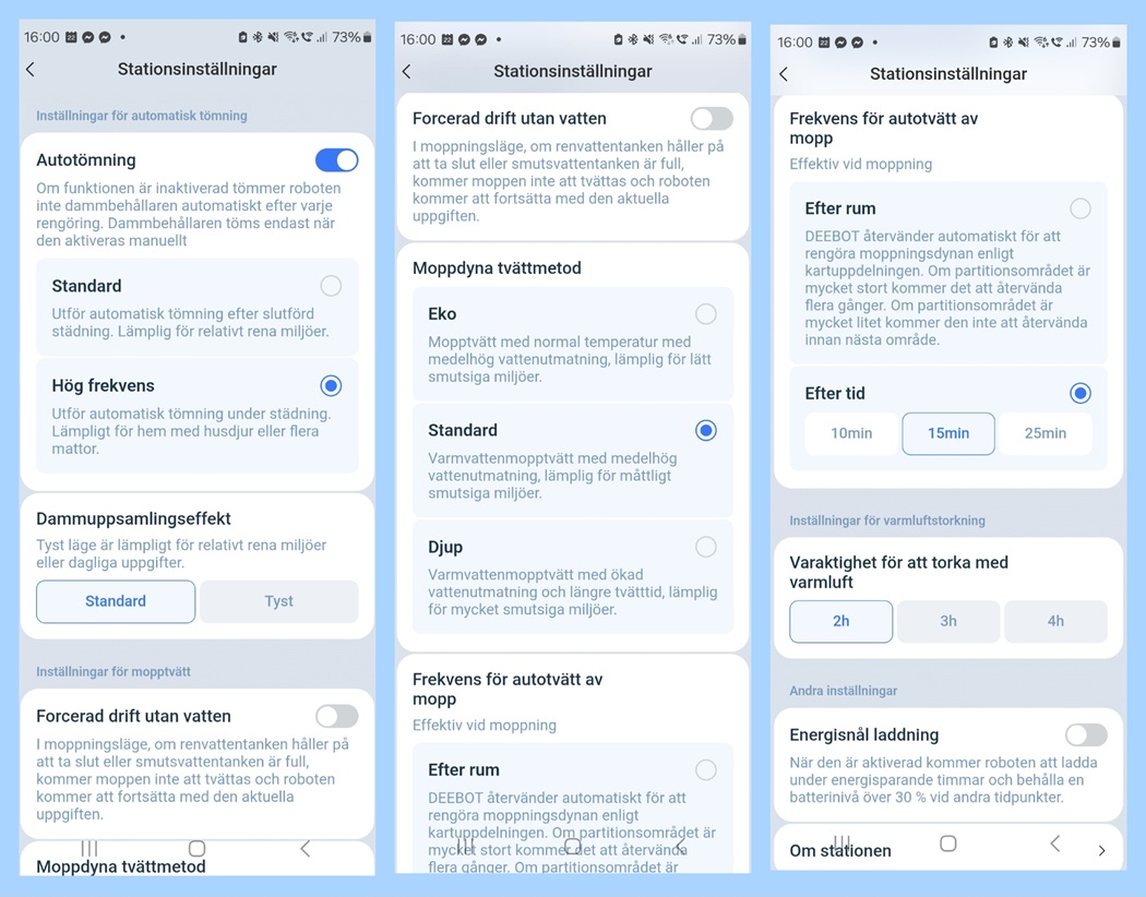 Når jeg mopper, vil jeg gerne have, at mopperne er så rene som muligt, og i app’en kan jeg indstille, hvor ofte jeg vil have, at støvsugeren skal gå tilbage til opladnings-/tømningsstationen for at vaske mopperne. Når mopperne er færdige, rengøres de med 70 grader varmt vand og tørres derefter med varm luft. Det føles hygiejnisk og friskt.