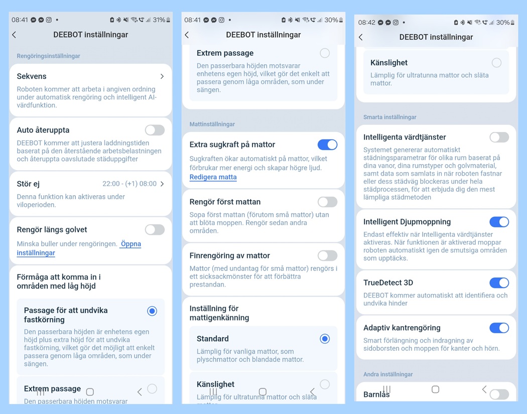 I Ecovacs Home-app’en kan jeg foretage en række forskellige indstillinger, så rengøringsoplevelsen passer til mig og mit liv. Jeg kan selvfølgelig lave tidsplaner, indstille no-go/no-mop-zoner og beslutte, hvordan forskellige rum skal rengøres. Ecovacs har også indset, at ikke alle tæpper er rektangulære, og jeg kan også vælge at markere runde tæpper på kortet i app’en.