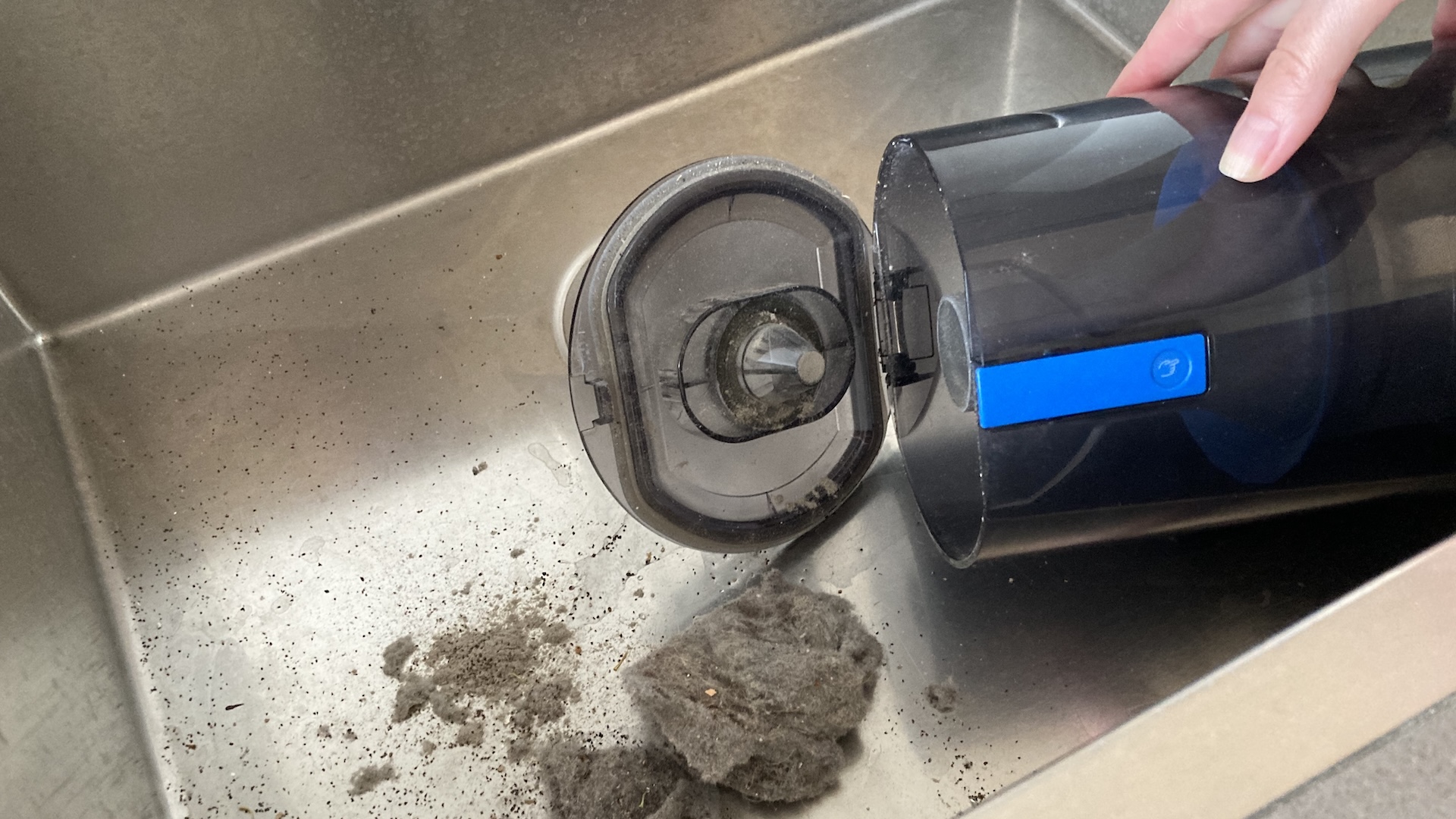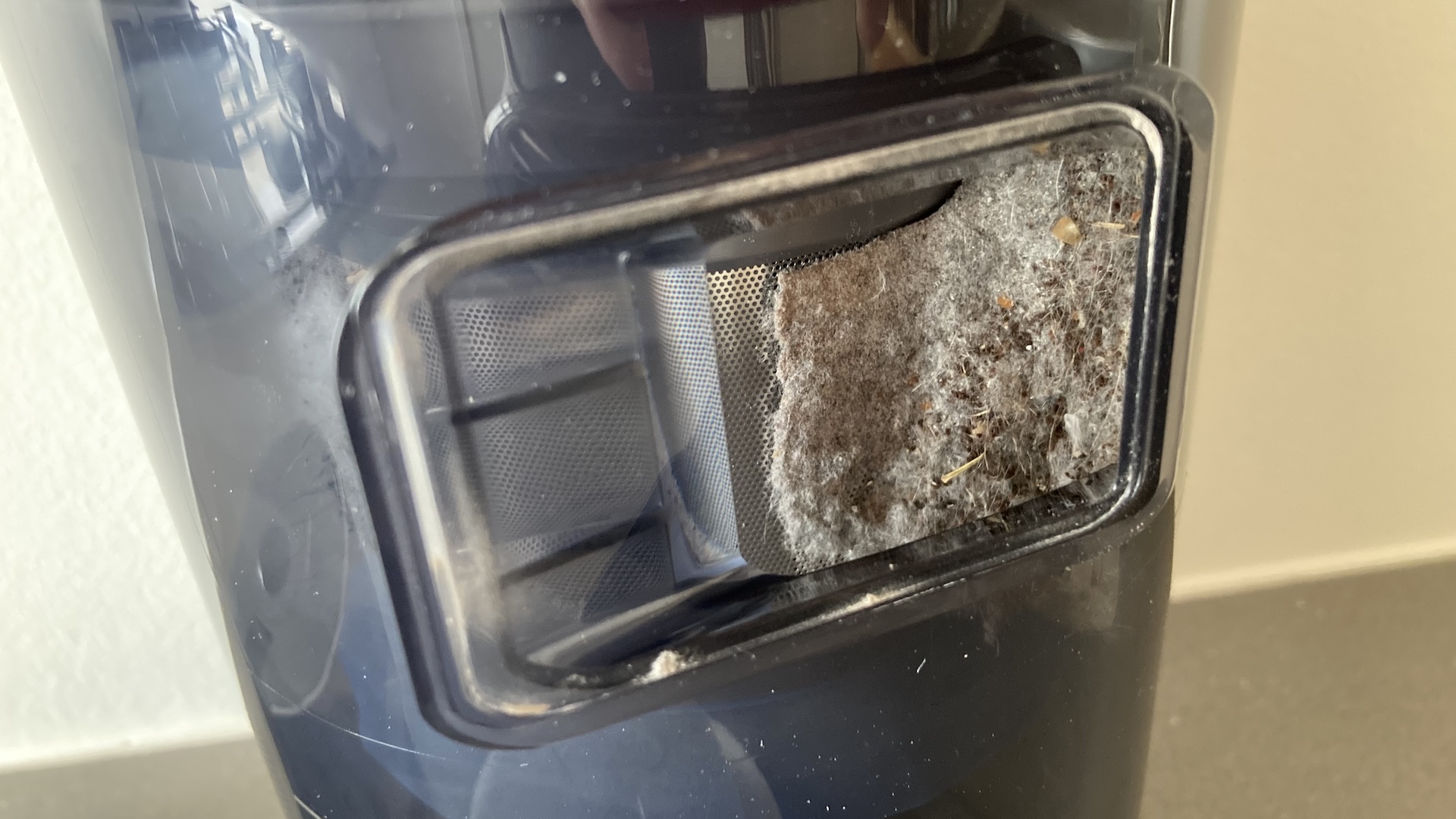 Opsamlet skidt fra robotten. I app’en beder du om en tømning af kammerets øverste del, så det lander nede i bunden af beholderen. (Foto: Natasja Broström)