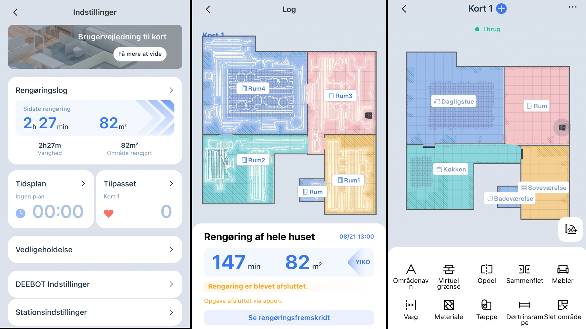 Deebot X11 var cirka 12 minutter om kortlægningen af 82 m2. Imponerende hurtigt, men med et par mangler. Lidt af fordelingsgangen kom (trods et dørtrin imellem) til at tilhøre spisestuen. Køkken, gang og entre blev opfanget som ét rum og måtte adskilles inde i app’en.