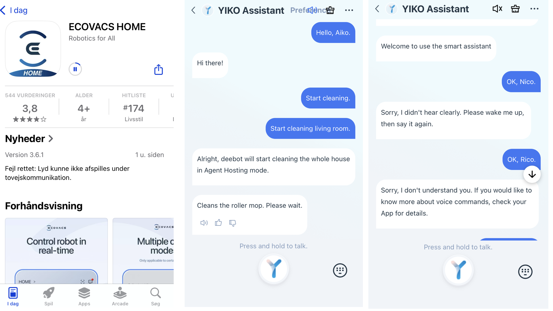 Yiko er mere samarbejdsvillig, end i min test af Deebot Omni X8. Assistenten opfanger forskellige talte kommandoer. Du finder listen over muligheder inde i app’en.