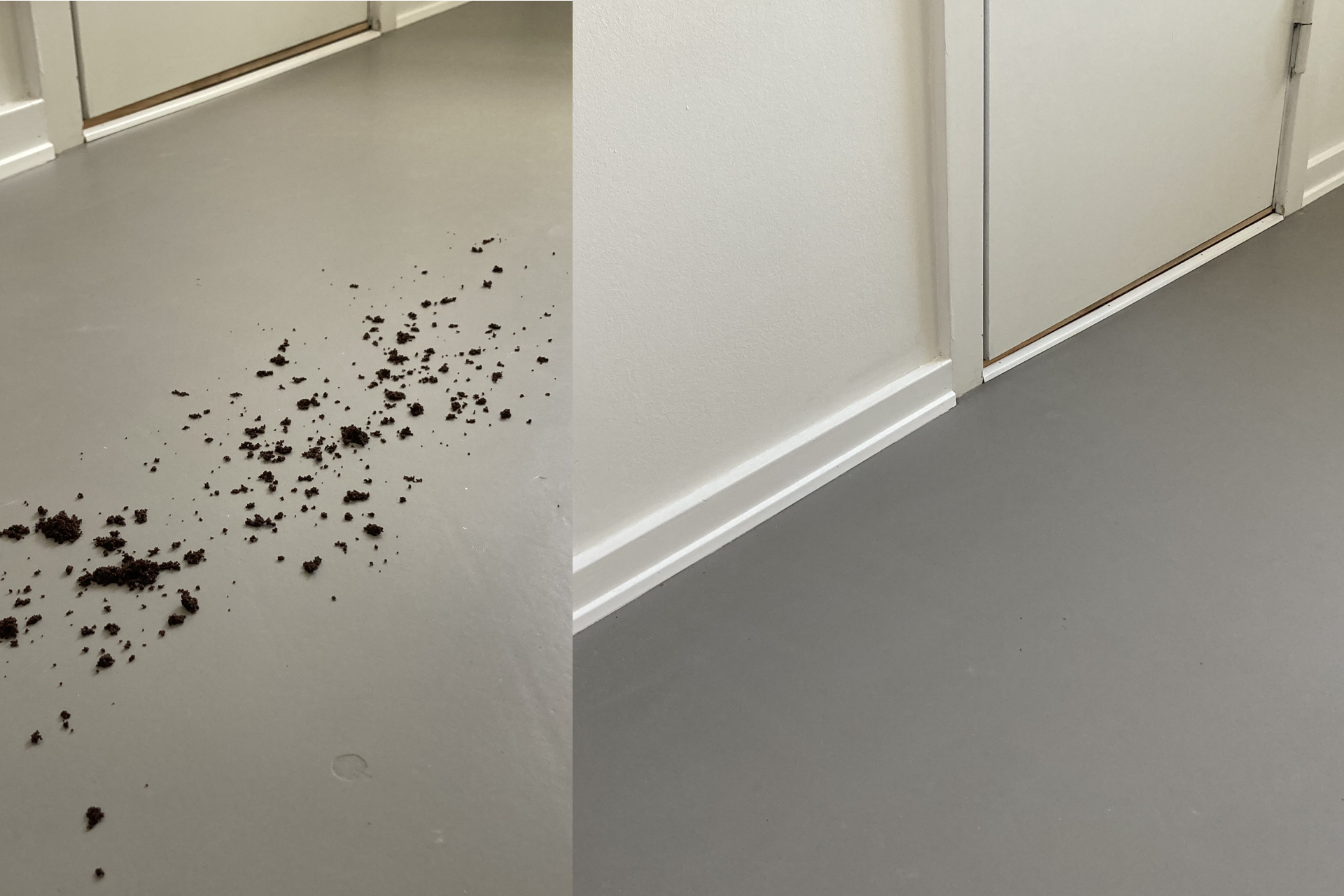 Halvfugtigt kaffegrums udfordrer en rullemoppe, da snavset kan blive gnedet rundt og ikke samlet op. Deebot X11 løste dog opgaven perfekt. (Foto: Natasja Broström)
