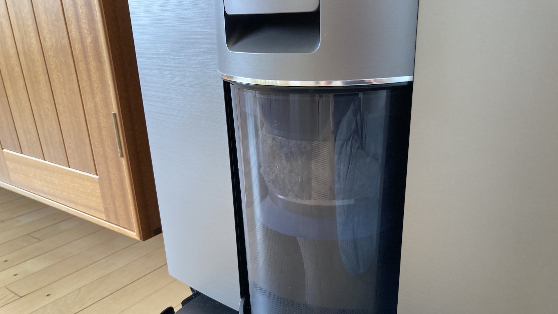 Som nævnt er basestationen poseløs. Når robotstøvsugeren vender hjem og afleverer en ladning skidt, bliver det suget ind i støvkammeret midt i basen. Indholdet er (mindre delikat) synligt udefra.