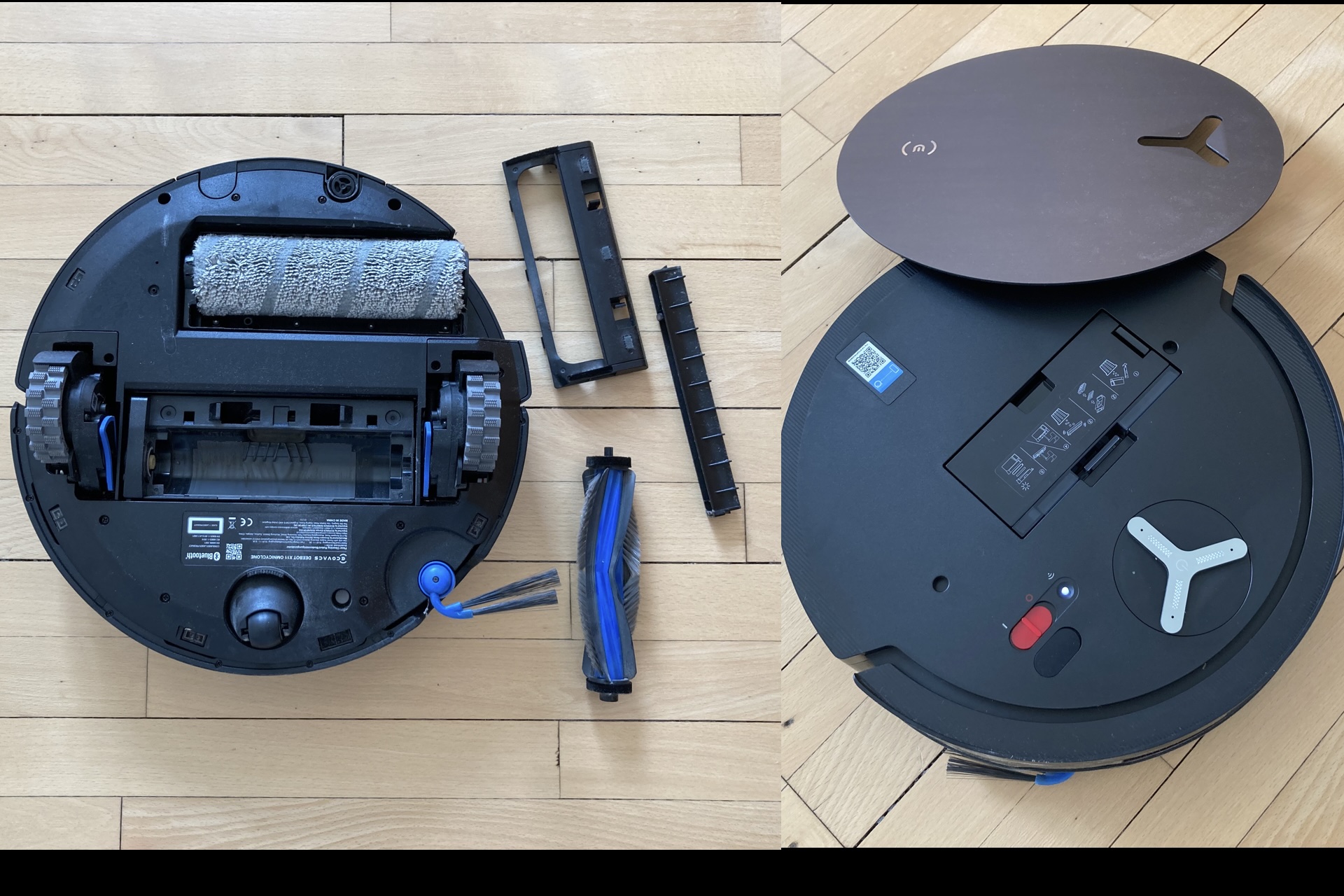 Over- og underside af Deebot X11. Design og udstyr ligner de fleste rengøringsrobotter. Hjulene hæver og sænker sig i forhold til forhindringer, som robotten skal passere. (Foto: Natasja Broström)