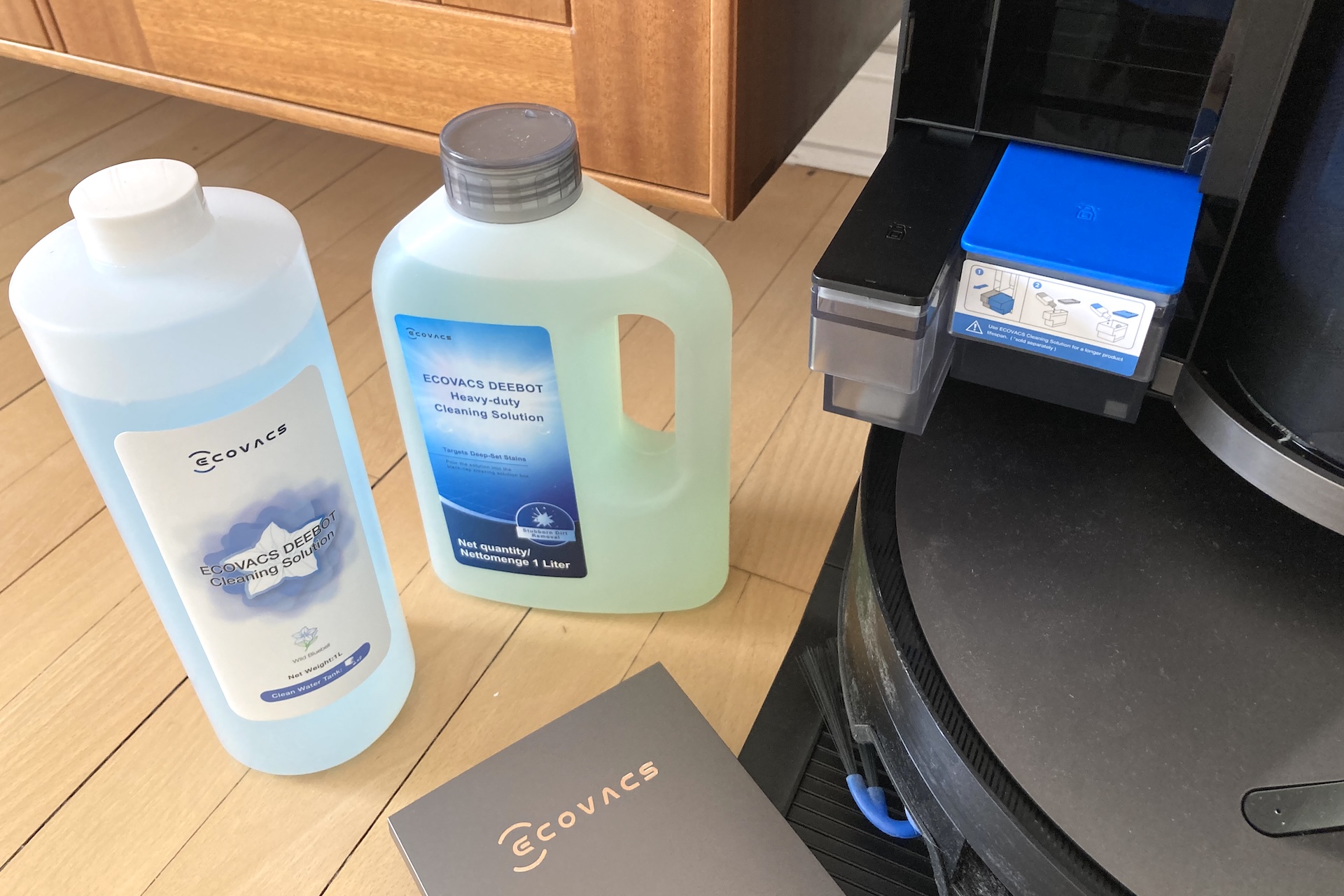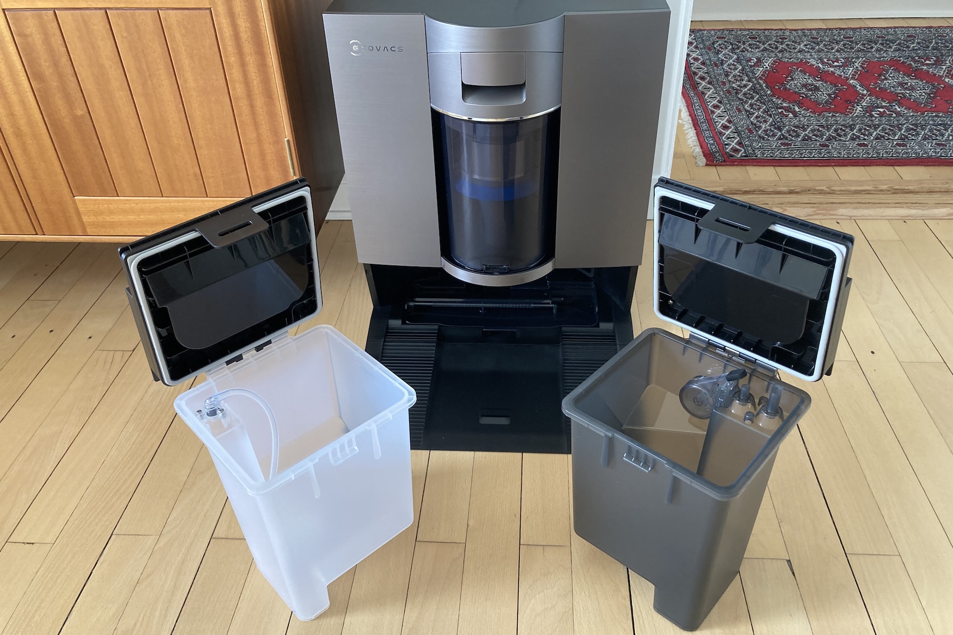 Basestationens sidekammer har to beholdere til henholdsvis almindeligt og koncentreret rengøringsmiddel. Begge dele doseres automatisk, alt efter dit valg af rengøring i app’en. (Foto: Natasja Broström)