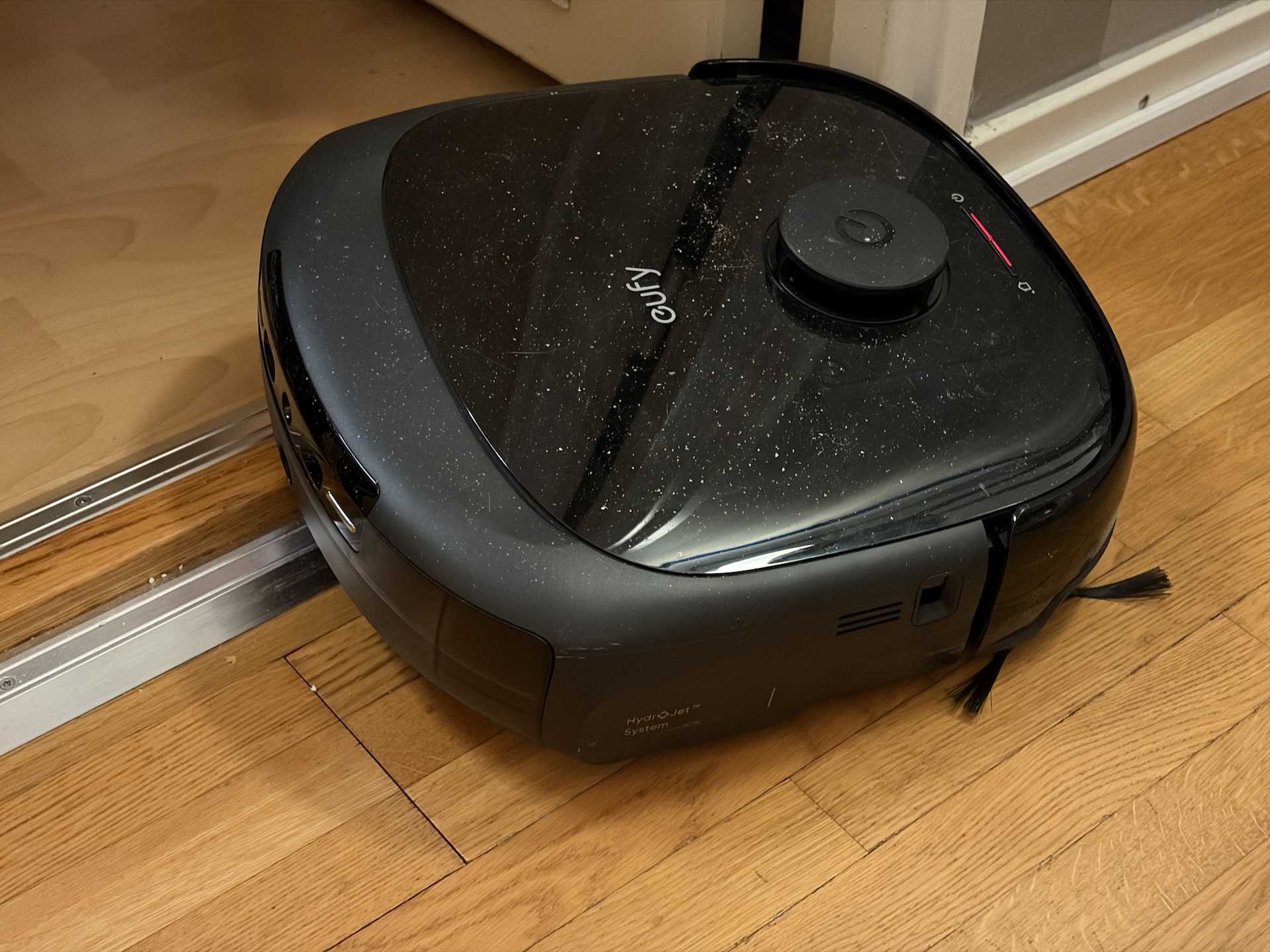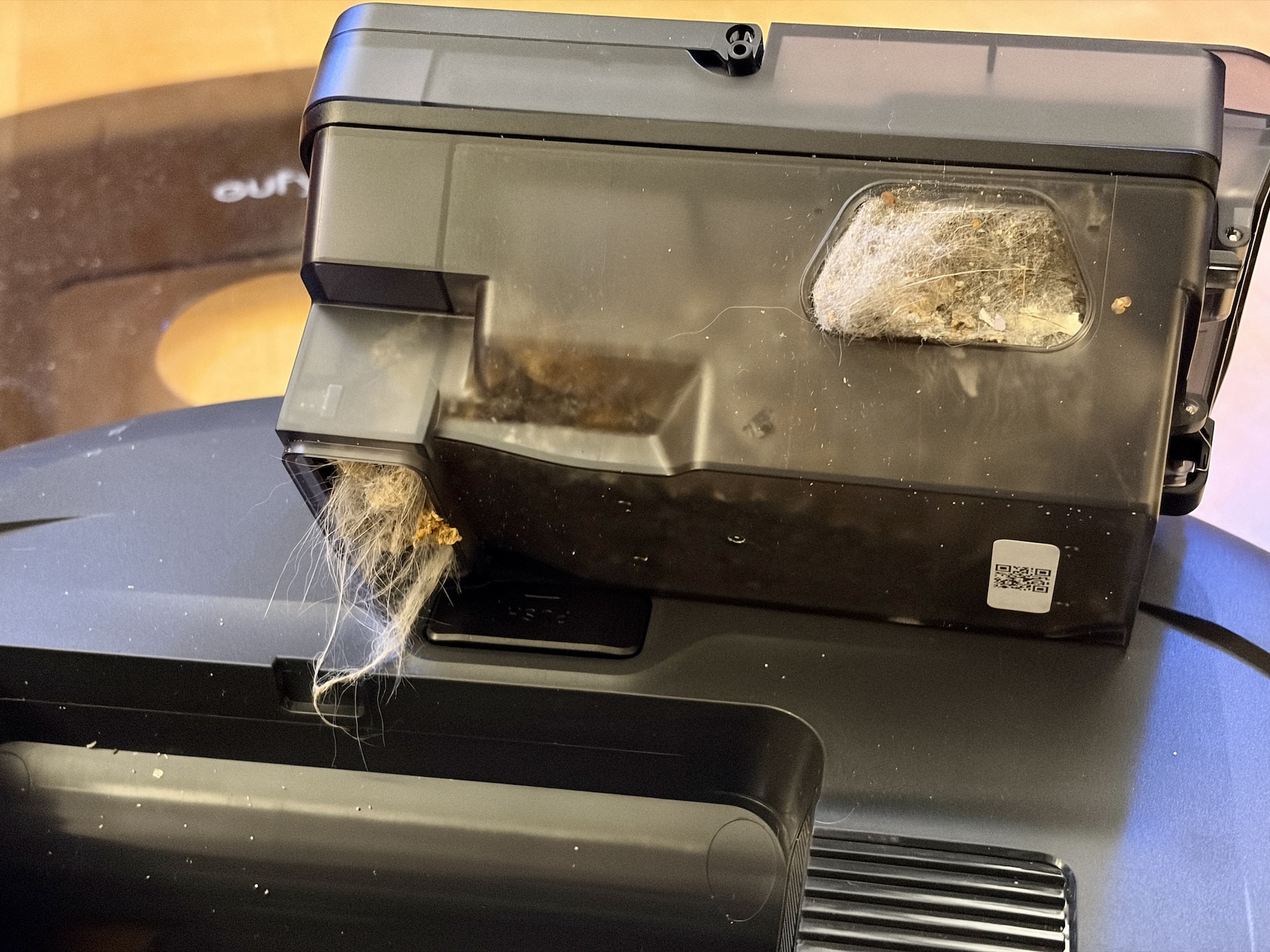 Med en sugestyrke på 20.000 Pa er dette en af de kraftigste på markedet, selvom den må se sig slået af Roborock Saros 10. De to valser med børster og gummiskrabere skubber skidt mod midten, hvor det løsnes, hvilket modvirker, at hår sætter sig fast i valserne. Det er samme konstruktion som Dyson V16 Piston Animal og fungerer fremragende. Mindre godt er det, at kattehår siden satte sig fast i indsugningen og støvbeholderen i stedet. At der endda findes en dedikeret instruktionsvideo om, hvordan man fjerner hår, der sætter sig fast i robotten og basestationen, siger os, at det ikke kun er os, der har haft problemer med dette.