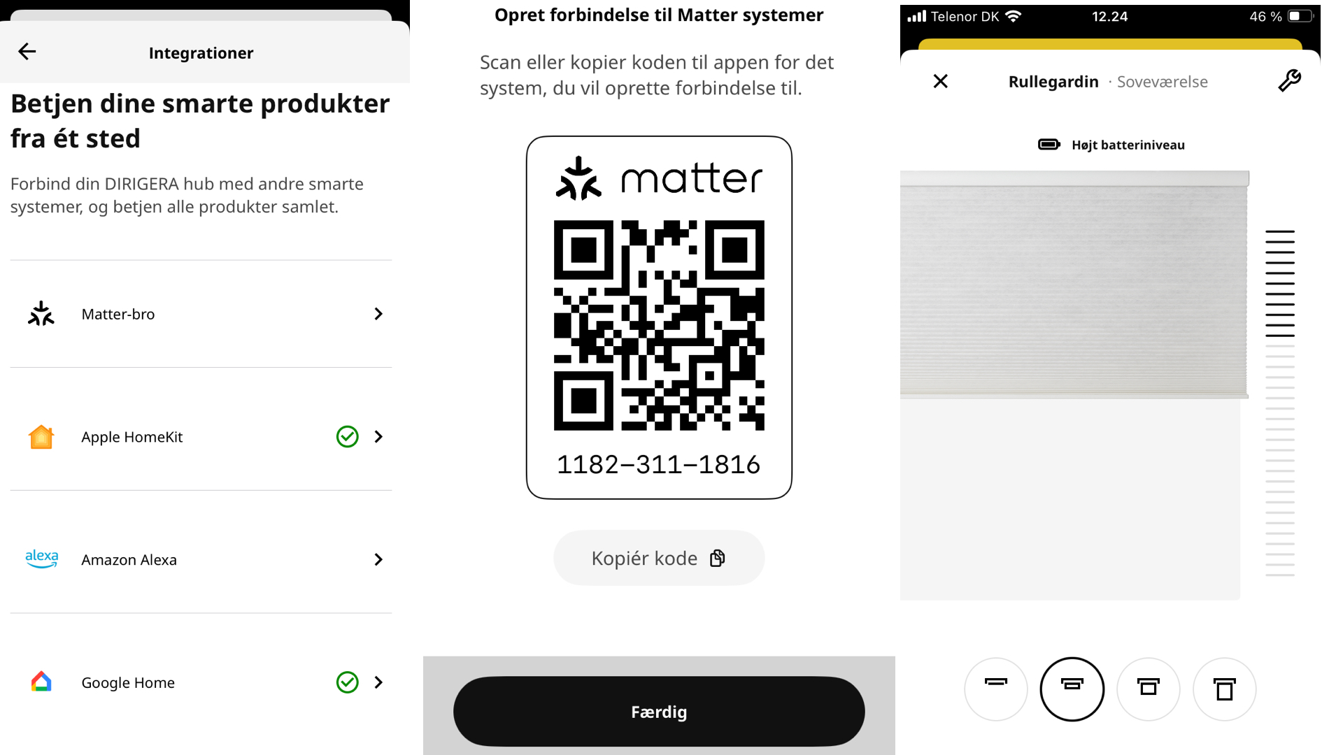 Først skal Dirigera gøres til Matter-bro under Integrationer i Home Smart. Matter-koden bliver generet digitalt og sidder således ikke fysisk et sted. Jeg gemte et skærmdump af koden og fik den skannet fra en ekstern skærm. At gemme og overføre den digitalt til den relevante platform (HomeKit) virkede ikke for mig.