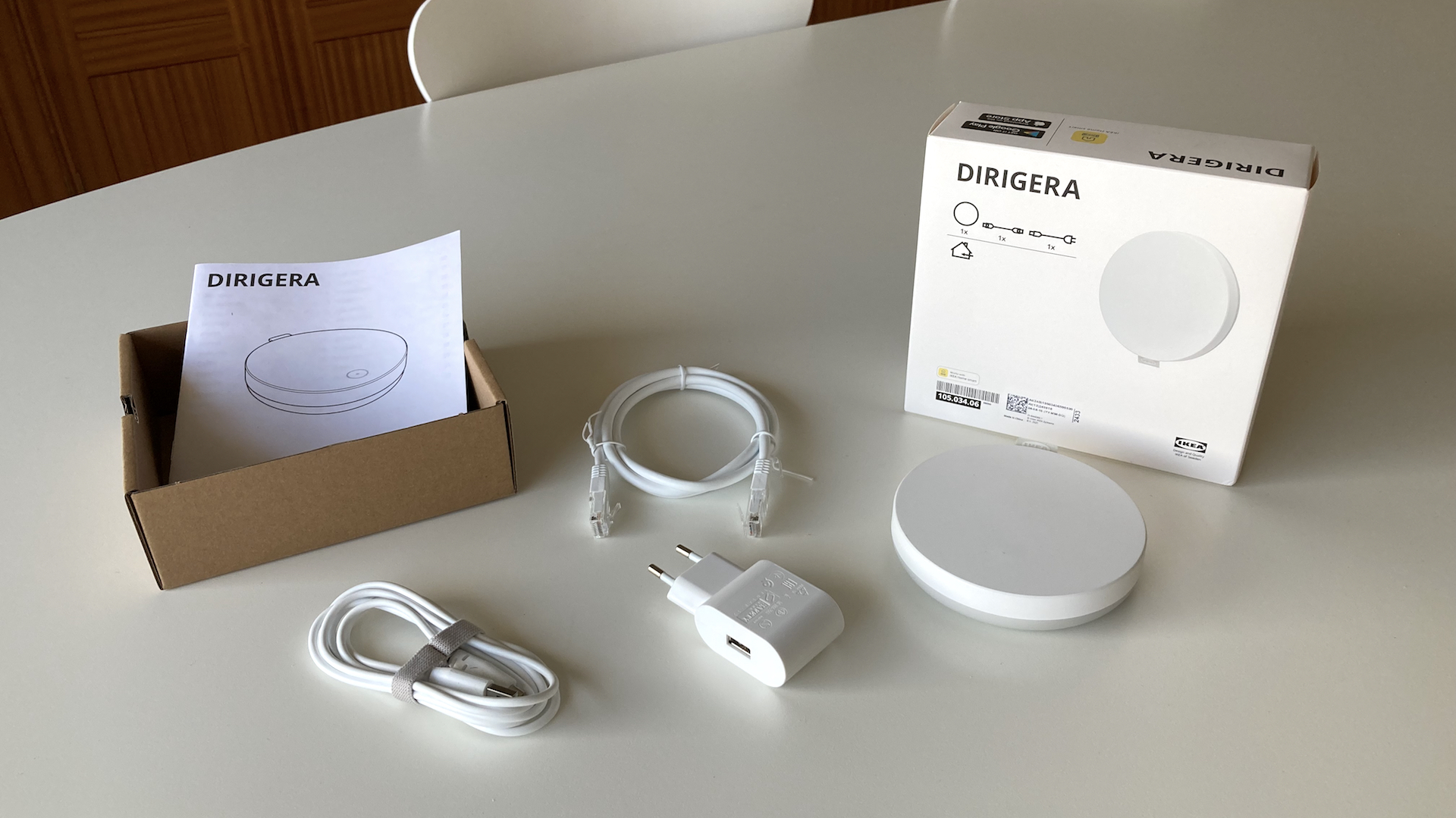 Dirigera skal købes særskilt og koster 499 kroner. Ethernet-kablet fra Dirigera skal i din router. Derefter skal hubbens strømkabel i stikkontakten. Begge kabler medfølger i æsken.