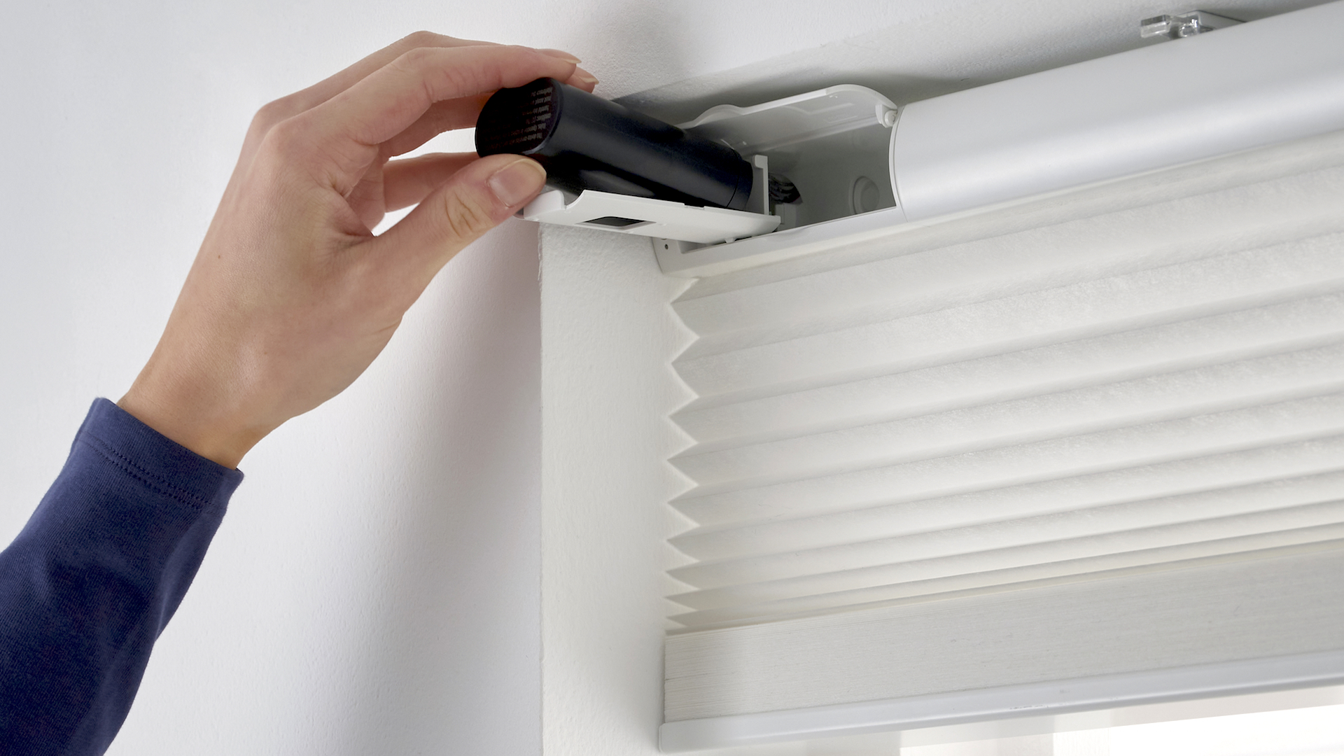 Tryk frontens to knapper ind, og gardinet gør en hurtig bevægelse op og ned som signal til, at gardinet er klar til brug og blive parret med den medfølgende fjernbetjening. Herefter er det blot at koble hubben Dirigera på dit hjemmenetværk og komme i gang med IKEAs app, Home Smart.